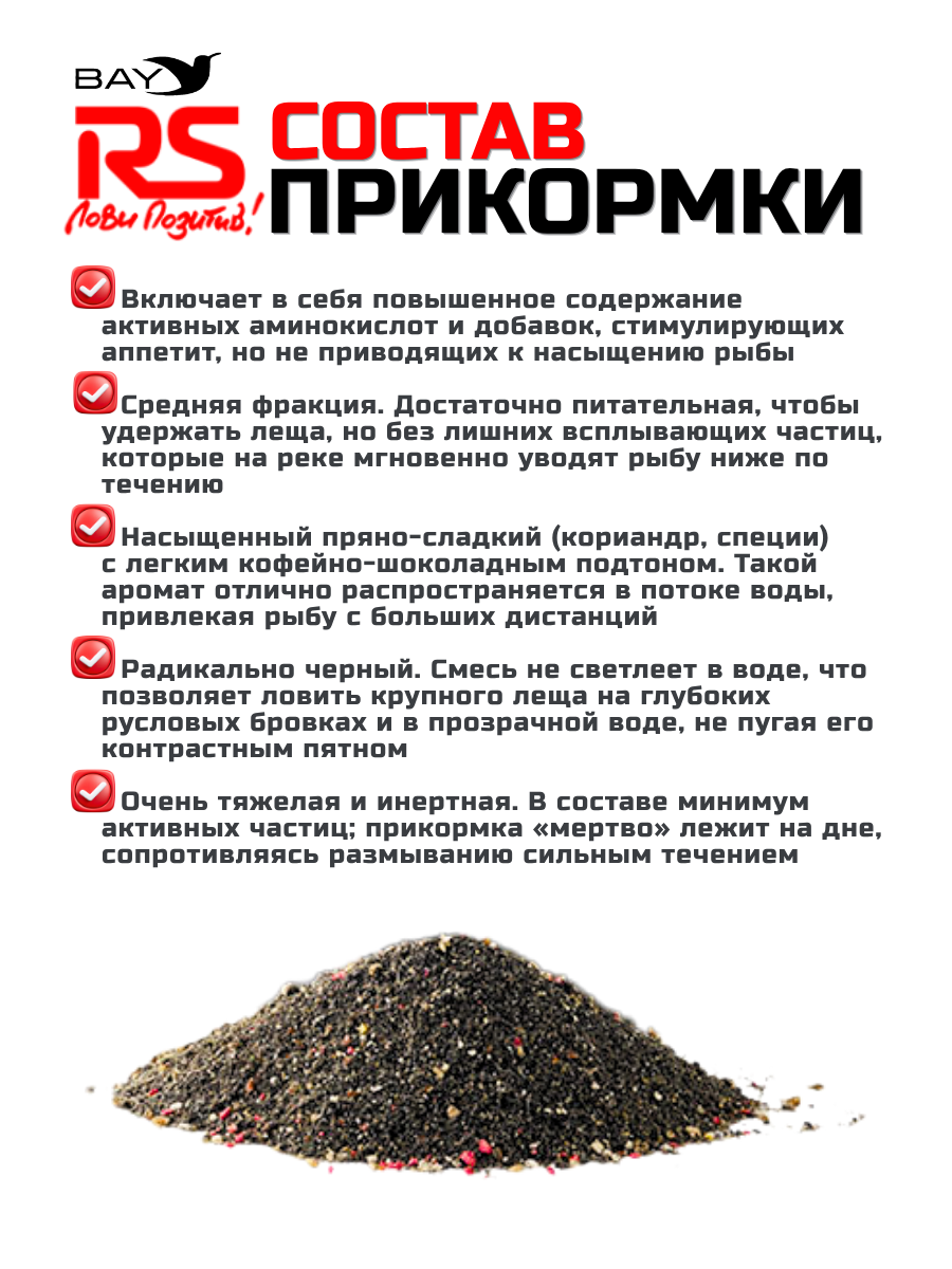 RS Black Series - это новая серия рыболовных прикормок темного цвета. Серия разработана специально для сложных условий и позволяет приманить на точку даже самую осторожную рыбу. Богатый и разнообразный состав, а также понятная механика работы этой прикормки позволят применять её абсолютно в любых условиях наших водоемов.