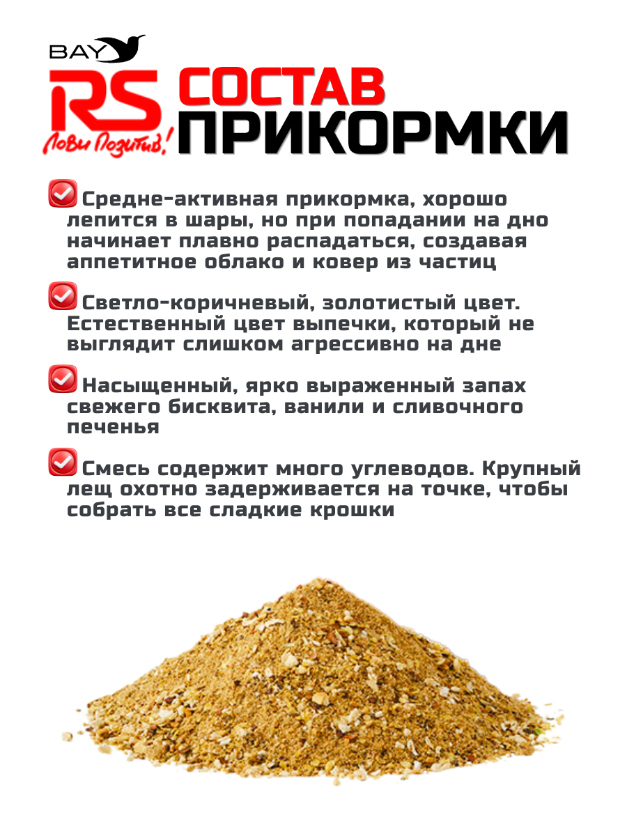 Облако ароматной мути, создаваемое прикормкой на дне, стимулирует леща к поиску питательных частиц. В качестве крупной фракции в прикормке содержится большое количество красного пастончино. Сладкий, тяжелый бисквит придает смеси липкость и питательность. Рекомендуем увлажнять в два этапа с последующим просеиванием через сито.