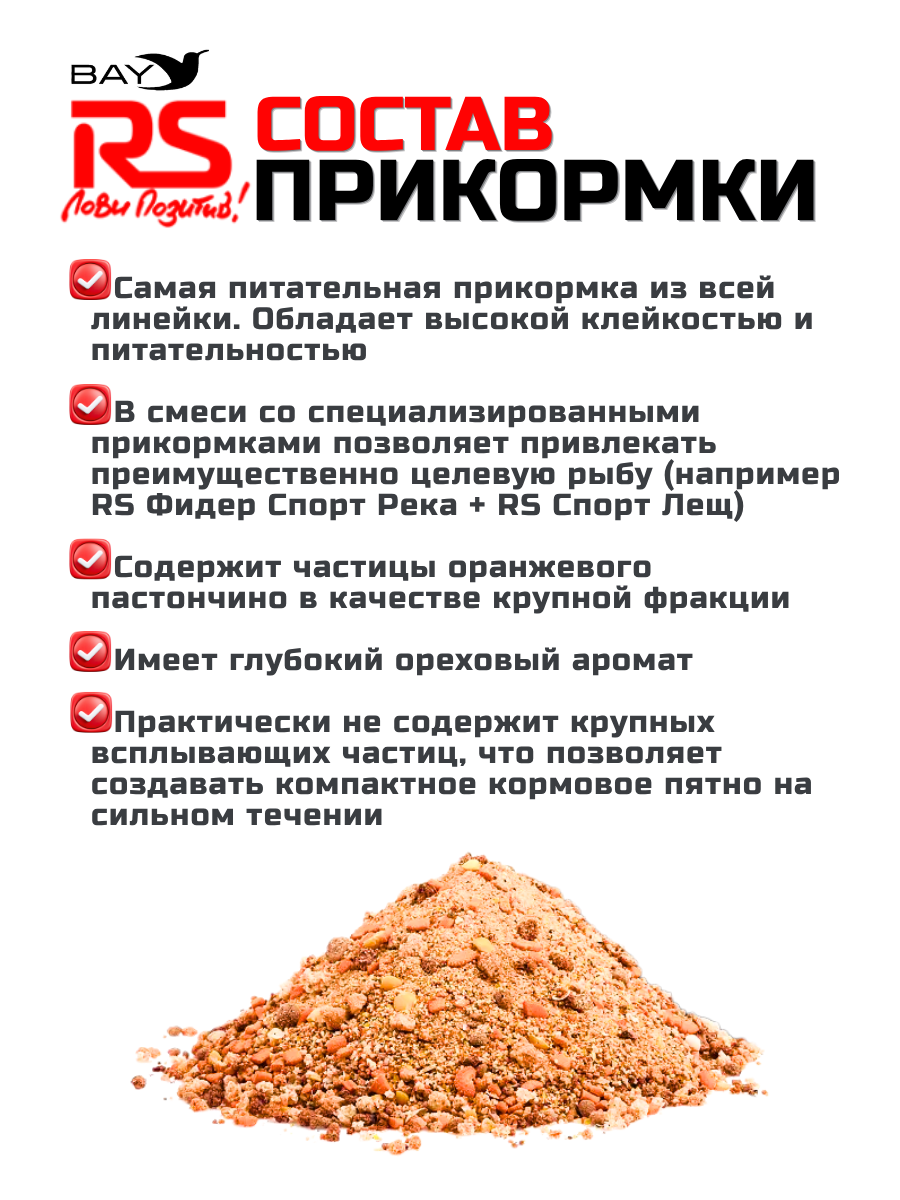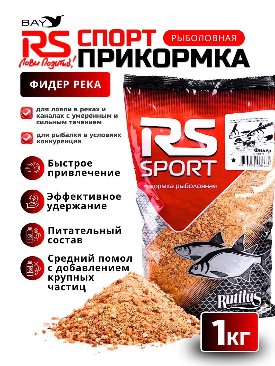 Уникальная речная прикормка. Применяется в реках и каналах с умеренным и сильным течением как самостоятельная прикормка для привлечения всех видов рыб семейства карповых. В смеси со специализированными прикормками позволяет привлекать преимущественно целевую рыбу (например RS Фидер Спорт Река + RS Спорт Лещ). Обладает высокой клейкостью и питательностью. Самая питательная прикормка в ассортименте компании. Содержит в своем составе частицы оранжевого пастончино в качестве крупной фракции. Специально для этой прикормки производится сладкий, тяжелый бисквит с заданными свойствами. Отличительной особенностью прикормки является её инертность, практически не содержит крупных всплывающих частиц, что позволяет создавать компактное кормовое пятно на сильном течении. Прикормка имеет глубокий ореховый аромат. Показывает хорошие результаты при ловле карпа на коммерческих водоемах.