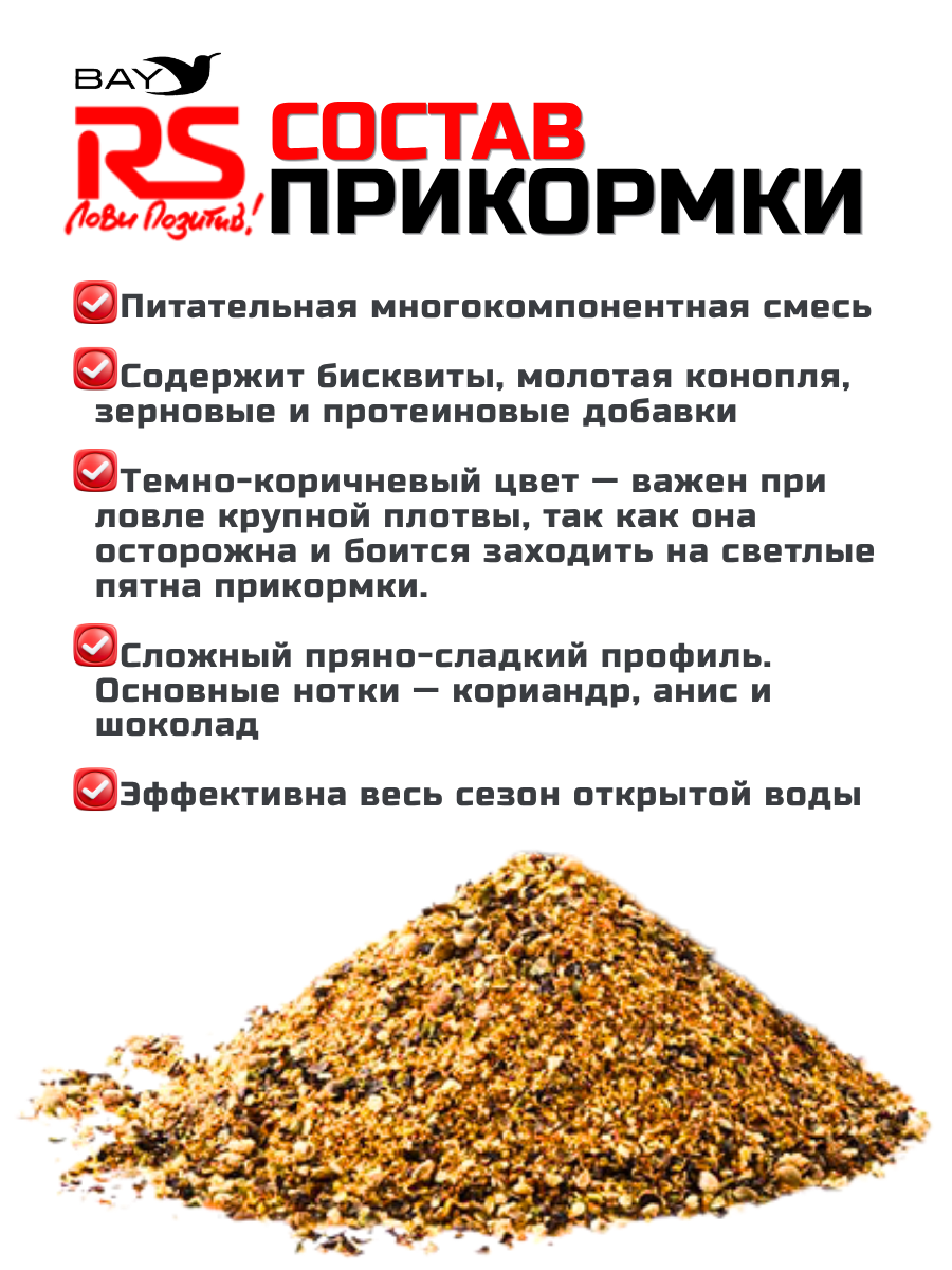 Специализированная прикормка для ловли плотвы. Отличается слабой клейкостью и высокой активностью частиц в воде. Ввиду этого рекомендуется применять прикормку в водоемах без течения и в неглубоких местах. В своем составе прикормка RS Плотва Спорт содержит около 5 процентов крупной фракции, представленной двумя видами бисквита и небольшим количеством дробленой кукурузы. Благодаря чему прикормка не насыщает рыбу, заставляя её быстрее реагировать на вашу наживку. В состав прикормки внесен комплекс аминокислот и протеин, рыба чувствует питательность, как результат – держится на точке, но не может насытиться. Имеет нейтральный сладкий запах и коричневый цвет.