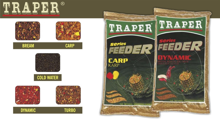 Ловля рыбы кормушечной снастью набирает всё большую популярность в последние годы. Поэтому эксперты фирмы TRAPER не обошли стороной этот способ и выпустили серию прикормок специально для любителей донной ловли. Прикормки серии "Feeder" позволяют в широких пределах менять свойства прикормки за счёт объёма добавляемой воды. Данные смеси содержат концентрированные вкусо-ароматические добавки, которые привлекают рыбу даже при малых объёмах используемой прикормки.
