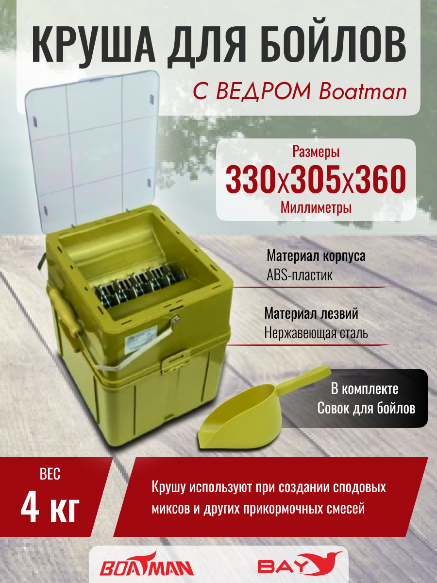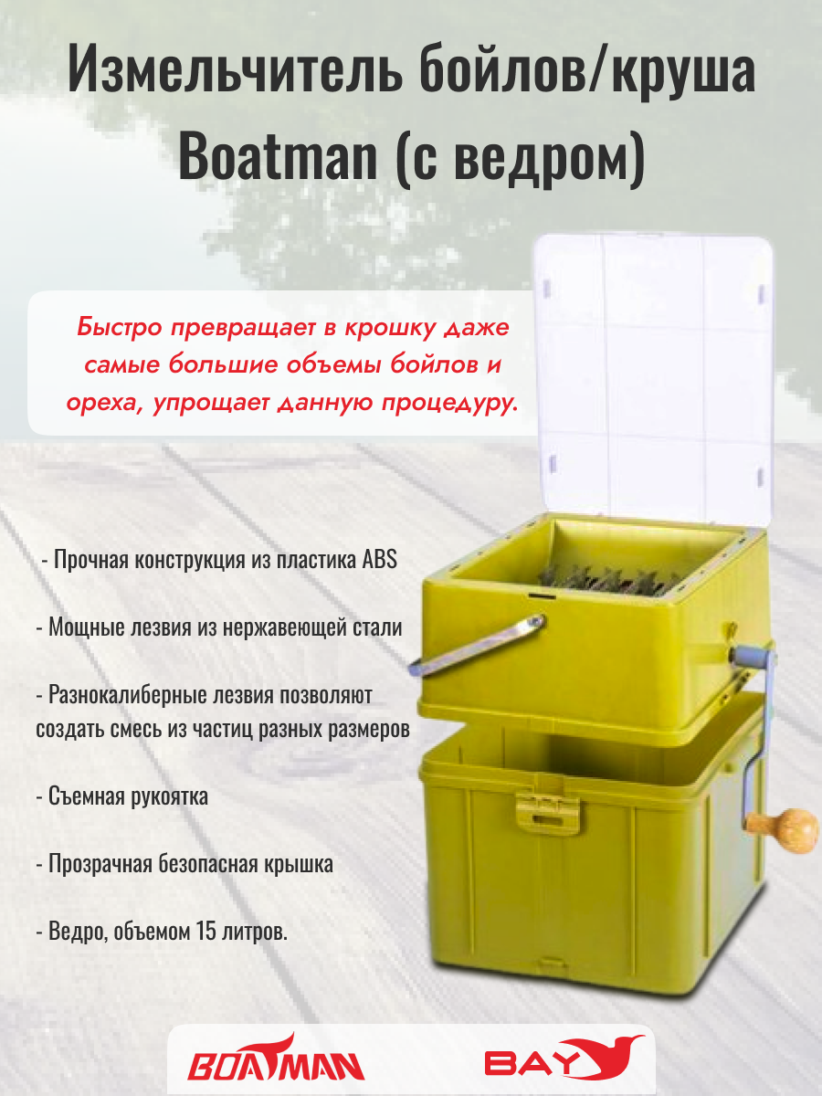 Измельчитель бойлов/круша Boatman, оснащенная мощными лезвиями из нержавеющей стали и быстросъемной рукояткой для удобства транспортировки, надежно фиксируется поверх 15-литрового стандартного ведра. Крушу используют при создании сподовых миксов и других прикормочных смесей. Быстро превращает в крошку даже самые большие объемы бойлов и ореха, упрощает данную процедуру. Подходит для создания стик-миксов, экономит ваше время. - Прочная конструкция из пластика ABS - Мощные лезвия из нержавеющей стали - Разнокалиберные лезвия позволяют создать смесь из частиц разных размеров. - Съемная рукоятка - Прозрачная безопасная крышка - Ведро, объемом 15 литров.