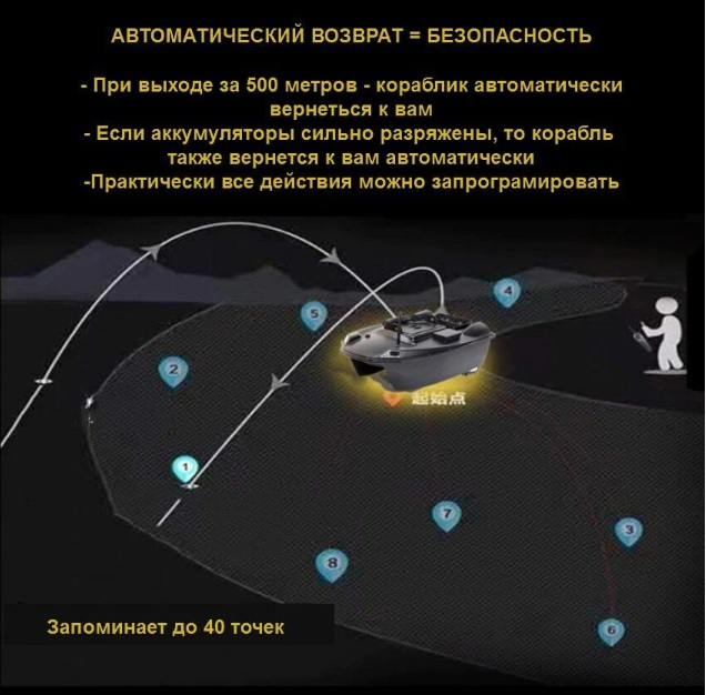 Хотите приобрести карповый кораблик с большой загрузкой для команды? - Модел Jabo T888GPS станет отличной покупкой, так как данный прикормочный кораблик сможет завозить за один раз сразу 3 килограмма прикормки, к нему можно закрепить беспроводной эхолот, а также он работает сразу от 2 мощных аккумуляторов, которых хватит на 8 часов ловли. Кроме того, кораблик оснащен удобным пультом, который позволяет управлять корабликом и всеми функциями одной рукой. Tакой кораблик способен запоминать до 40 точек сброса, а также автоматически доходить до точки сброса и возвращаться обратно и без GPS (в комплекте обычной пульт без GPS функций) - такая версия отлично подойдет для любительской ловли, когда у вас от 1 до 3 точек прикормки в близи. Стоит отметить и 3 отсека для загрузки прикормки: два центральных - из них прикормка сбрасывается под кораблик и отсек на корме - в него можно удобно заложить животный компонент (опарыш, мотыль, червь и пр.) и сбросить в последнюю очередь, чтобы "животный компонент" был над основной прикормкой. Также в отсек на корме можно положить беспроводной эхолот и сбросить в необходимом месте. Контейнеры для сброса открываются по отдельности с пульта.
