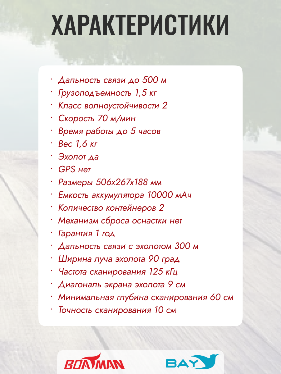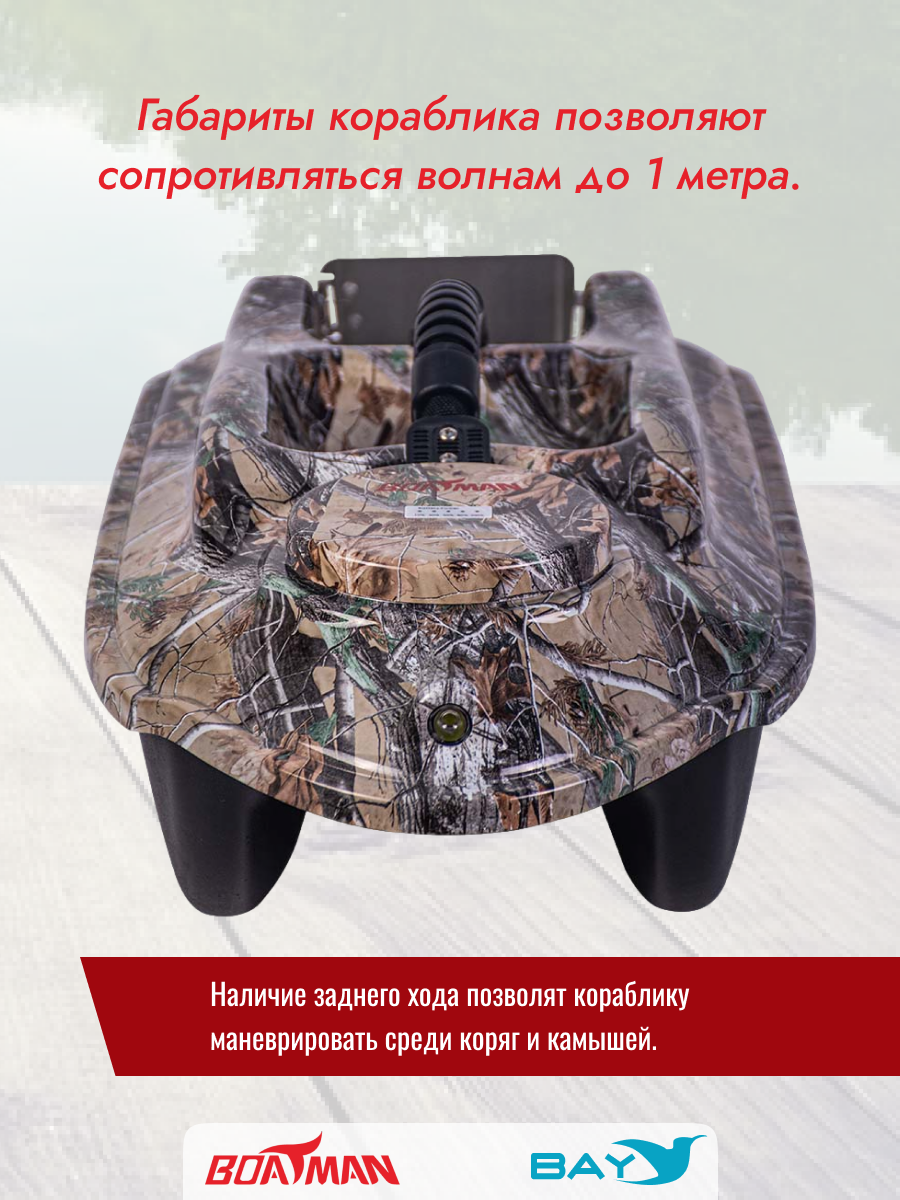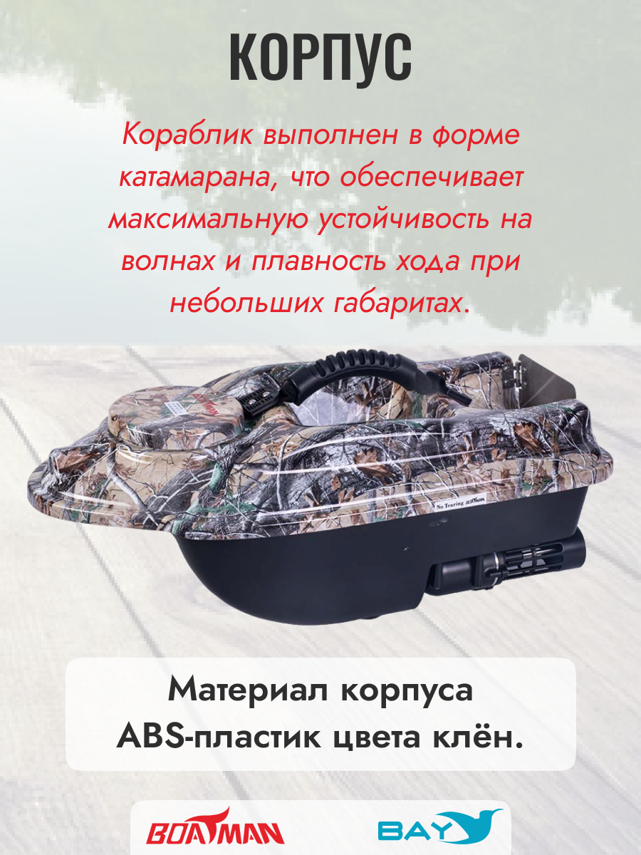 Корпус кораблика изготовлен из прочного пластика ABS с удобной ручкой для переноски. Габариты кораблика позволяют сопротивляться волнам до 1 метра. Наличие заднего хода позволят кораблику маневрировать среди коряг и камышей. Использование кораблика на расстоянии до 500 метров происходит благодаря пульту управления на 2.4 ГГц.
