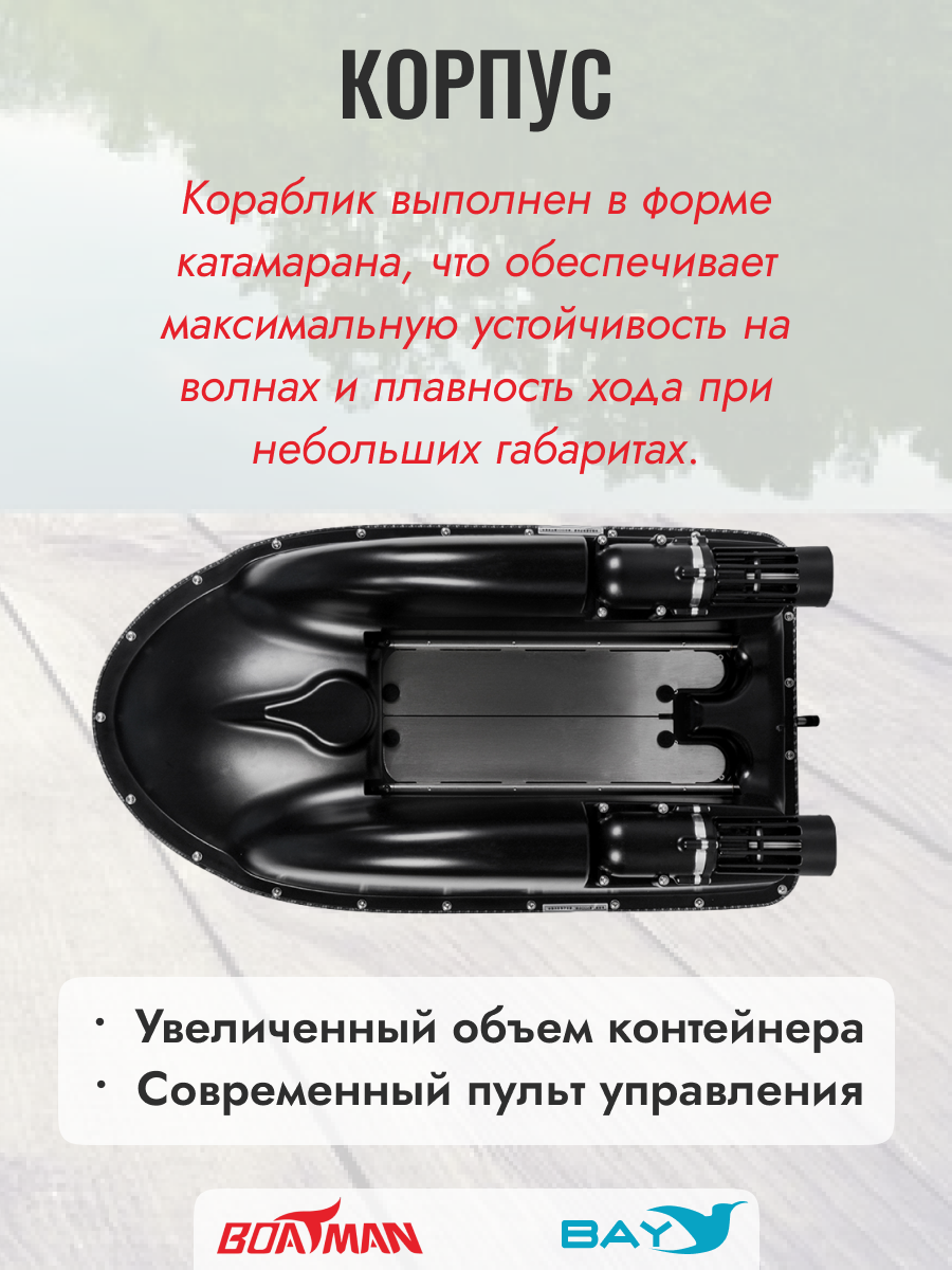 Корпус кораблика выполнен в форме катамарана, что обеспечивает максимальную устойчивость на волнах и плавность хода при небольших габаритах