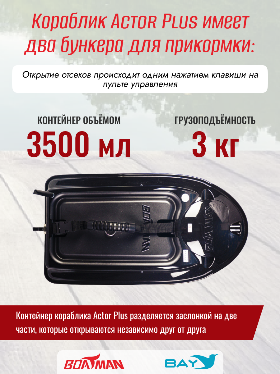 Контейнер кораблика Actor Plus объемом 3500 мл разделяется заслонкой на две части, которые открываются независимо друг от друга. Общая грузоподъемность кораблика 3 кг