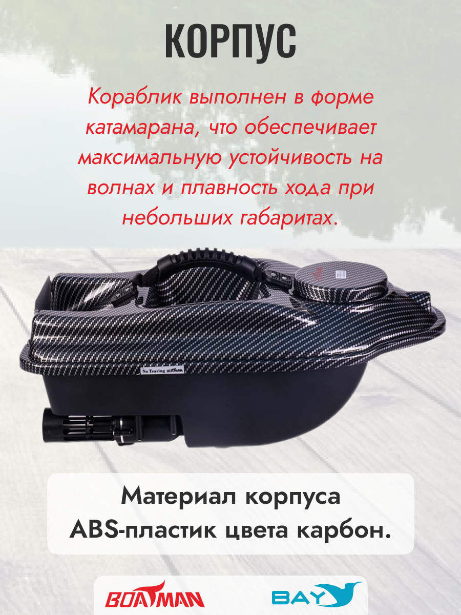 Корпус кораблика выполнен в форме катамарана, что обеспечивает максимальную устойчивость на волнах и плавность хода при небольших габаритах Материал корпуса - ABS-пластик цвета карбон.