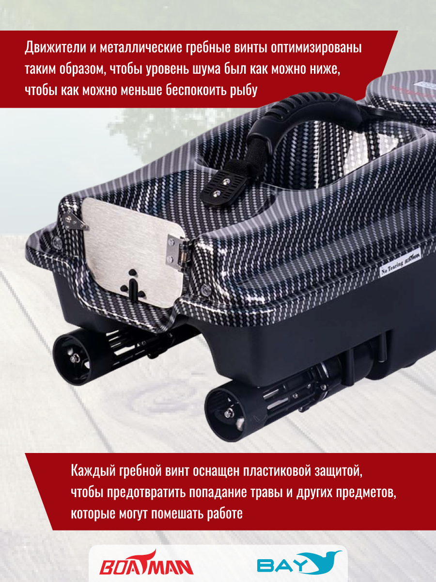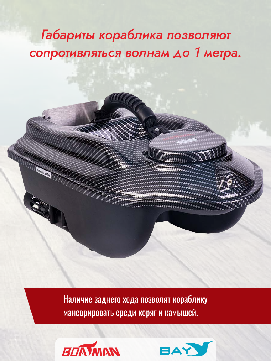С помощью надежно закрепленной к корпусу ручки вы без труда сможете перенести прикормочный кораблик с места на место, опустить в воду и поднять на берег
