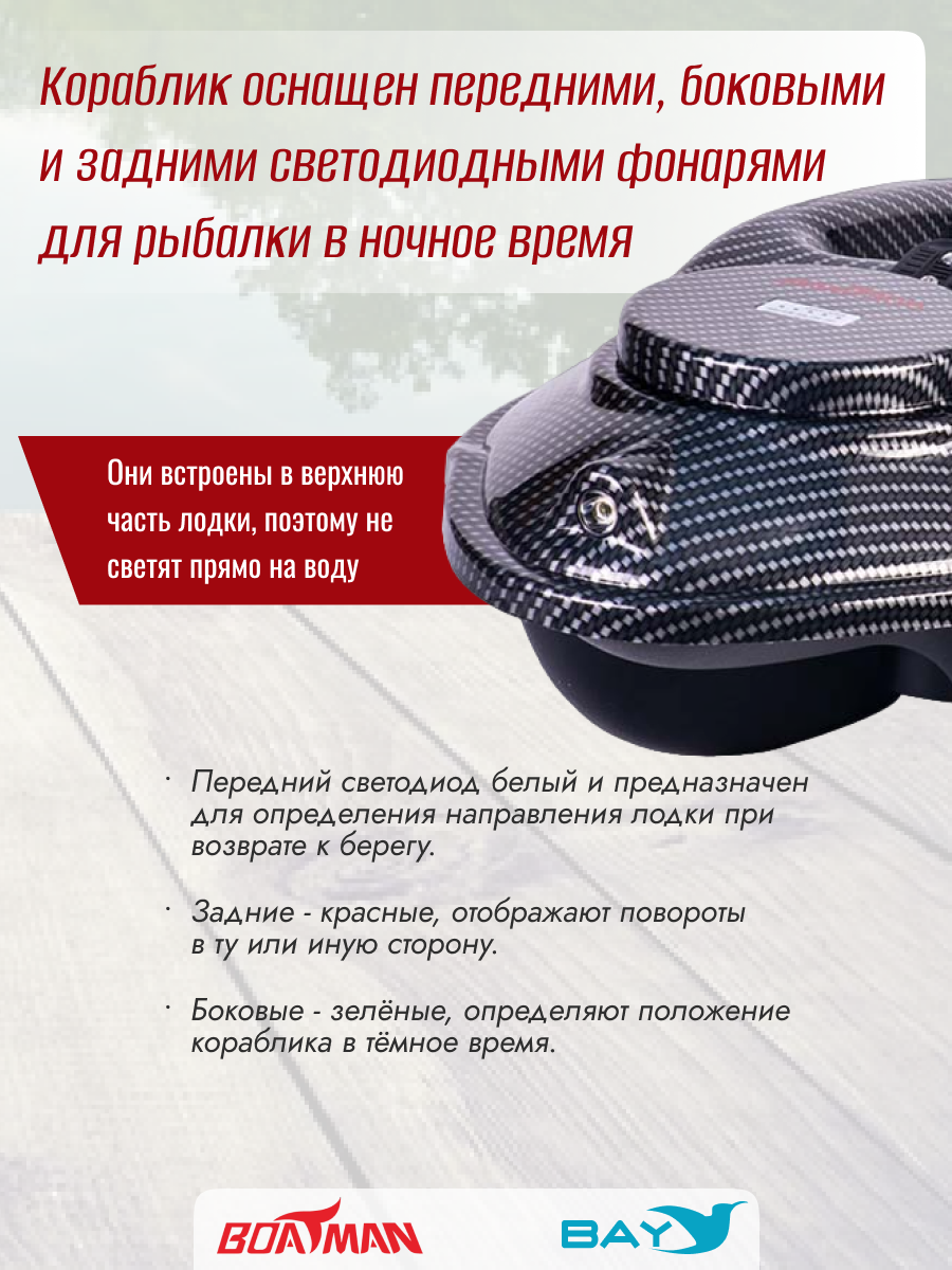 Передние и задние огни позволят вам пользоваться корабликом в любое время суток, а также облегчит его обнаружение на больших дистанциях