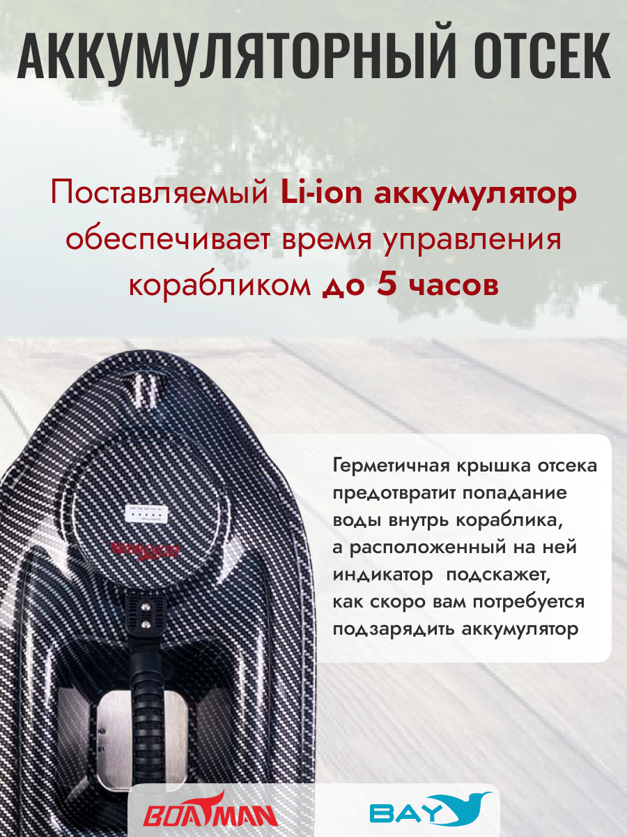 Герметичная крышка отсека предотвратит попадание воды внутрь кораблика, а расположенный на ней индикатор подскажет, как скоро вам потребуется подзарядить аккумулятор