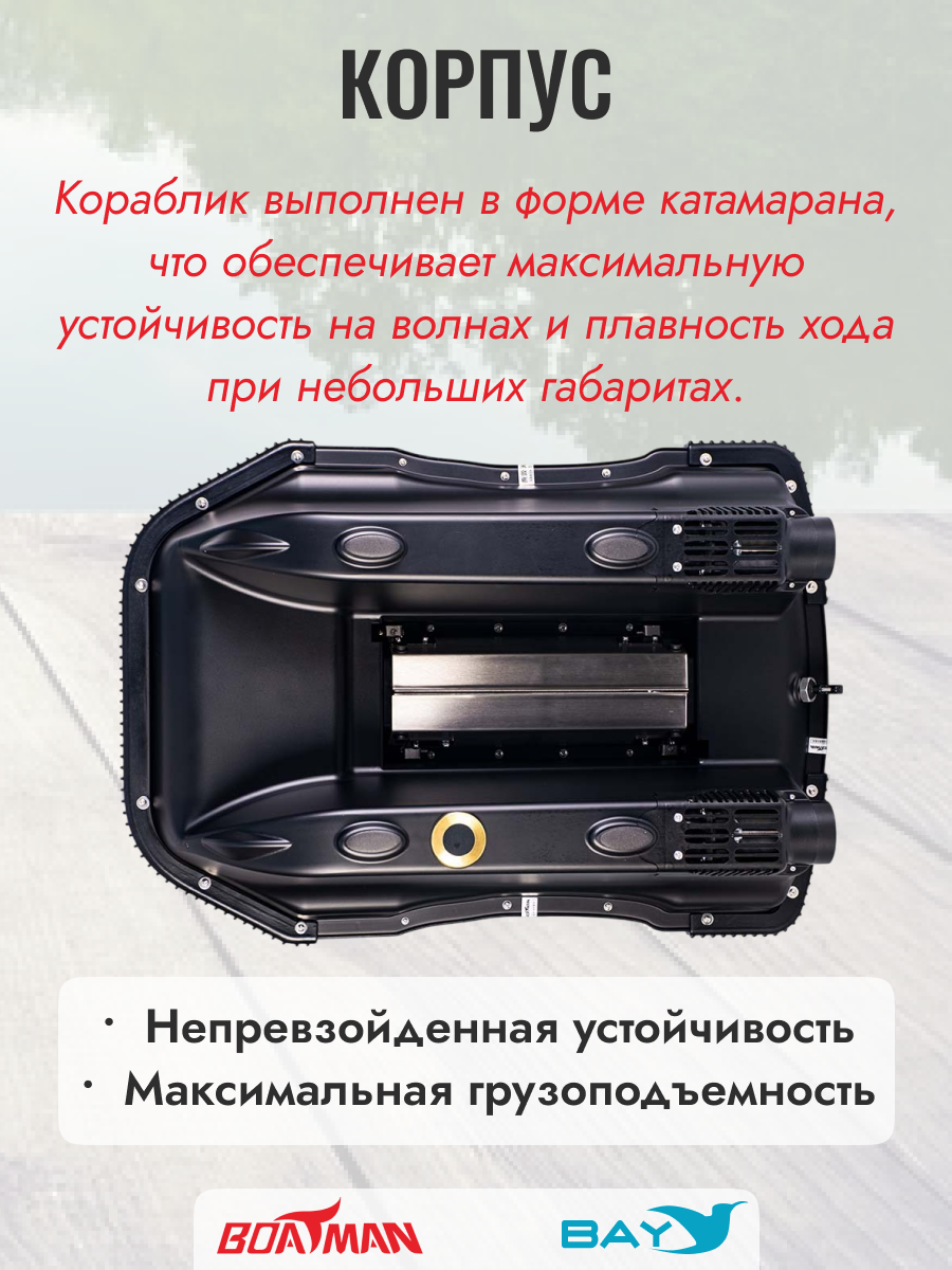 Корпус кораблика выполнен в форме катамарана, что обеспечивает максимальную устойчивость на волнах и плавность хода при небольших габаритах