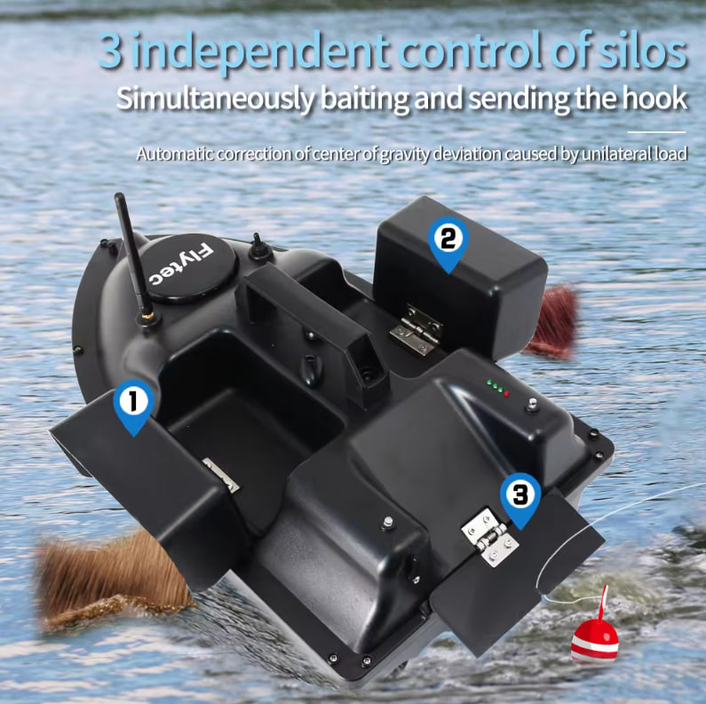 Яркий цвет прикормочного кораблика легко заметен даже на большой дистанции, а благодаря ярким габаритам вы без труда определите местоположение и направление судна даже в полной темноте. 3 погрузочных отсека кораблика удобны при различных вариантах загрузки: вы можете комбинировать прикорм, либо одновременно завозить прикорм и снасти. Передние погрузочные отсеки разгружаются в сторону, задний - назад. Также задний отсек имеет специальный вырез под леску для снастей. Корпус кораблика герметичен и защищен от попадания влаги, а на случай экстренной ситуации имеется дренажное отверстие на носу катера. Судно устойчиво ведет себя на волнах высотой до 1 метра даже при полной загрузке. Пульт управления имеет встроенный дисплей, на котором отображаются основные параметры катера и управление GPS навигацией. Джойстики пульта управляют винтами по отдельности. GPS навигация кораблика крайне проста. Для начала, после прибытия на водоем, необходимо откалибровать встроенный компас, затем задать стартовую точку и до 4-х точек прикорма. После выполнения этих действий достаточно лишь нажать одну из 4 точек на пульте, и кораблик автоматически поплывет к ней. Погрешность GPS составляет до 5 метров. GPS имеет полезную функцию - автоматический возврат к стартовой точке в случае потери сигнала пульта.
