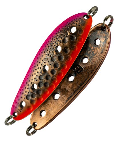 Блесна работает в широком диапазоне скоростей проводки, а также при ловле в отвес, допускает активную анимацию. Как следствие - добычей становятся не только лососи, но и жерех, судак, сом - на юге, озерный голец Таймыра и Кольского полуострова, жерех и щука на больших водохранилищах. Ловля в заброс, троллингом и в отвес - как зимой, так и летом - всегда эта блесна окажется на высоте!