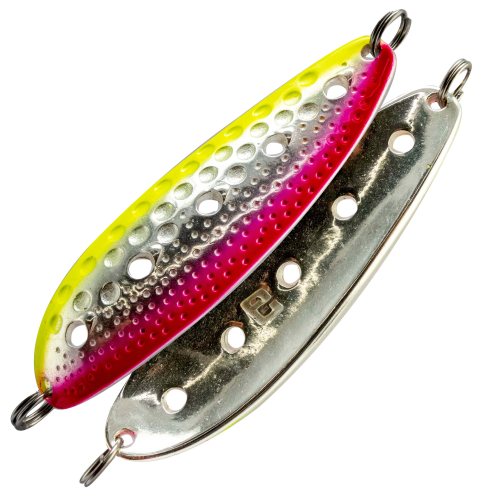 Блесна работает в широком диапазоне скоростей проводки, а также при ловле в отвес, допускает активную анимацию. Как следствие - добычей становятся не только лососи, но и жерех, судак, сом - на юге, озерный голец Таймыра и Кольского полуострова, жерех и щука на больших водохранилищах. Ловля в заброс, троллингом и в отвес - как зимой, так и летом - всегда эта блесна окажется на высоте!