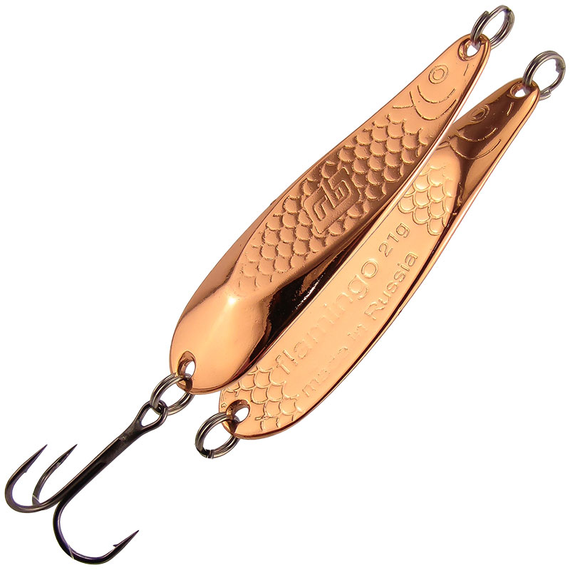 Фламинго имеет несколько вариантов покрытия: медь, латунь, серебро, и комбинацию серебра и золота. Поверхность блесны покрывается водостойким лаком, препятствующим окислению и сохраняющий привлекательный вид блесны.