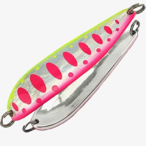 Традиционно для ловли лососей представлены самые востребованные веса и расцветки. Примечательно, что базовым покрытием блесен является голографическая пленка, на которую уже наносится индивидуальные цвета. Такое сочетание бликов с ультрафиолетовым лаком, лучшим образом сказывается на уловистости блесен. В ходе испытаний на водоемах России, у этой блесны обозначилась еще одна ее особенность, это эффективная работа при вертикальном блеснении зимой со льда. Первые успешные отзывы пришли к нам от рыболовов Сибири, которые применяли эти блесны по щуке и судаку.