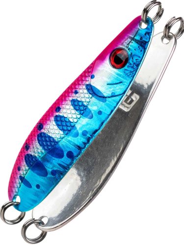 Блесна RB Yuzi - новинка от компании Русская Блесна, которая работает в широком диапазоне условий на быстрых и горных реках. Основной список трофеев это семга, чавыча, таймень, кижуч, сима, голец и другие. Данная приманка максимальна адаптивна в сложных и меняющихся условиях быстрых рек, и ловит разноплановую рыбу. Гибридная форма блесны является предпочтительным вариантом, между узкими и наоборот широкими блеснами. Приманка имеет смещенный центр тяжести, за счет этого обладает хорошей баллистикой и отлично держит речной поток, не выдавливаясь на поверхность. Небольшая выпуклость приманки дает минимальное лобовое сопротивление с обратной связью, давая возможность полностью контролировать проводку, и в тоже время она достаточна для разноплановых проводок, где можно легко менять технику ловли. Компания RB выпустила 4 варианта веса данной приманки: 25, 32, 37 и 42 грамма. Эти основные веса сгенерированы специально для рек Кольского полуострова и водоемов Дальневосточного региона. В цветовую линейку вошли как уже популярные цвета, так и новые современные генерации разработанные успешными рыболовами с учетом последних лет. Данная блесна применяется не только в лососевой программе, она эффективна при ловле традиционных хищников: щуки, судака и жереха. (Рекомендовано использовать на реках с течением). Данные блесны дополнительно оснащаются различными крючками на выбор, это может быть тройник, силовой одинарный крючок, ассист или ассист с октопусом. Крючки подбираются в зависимости от условий ловли в конкретной ситуации и внутренних правил рыболовства данного региона.