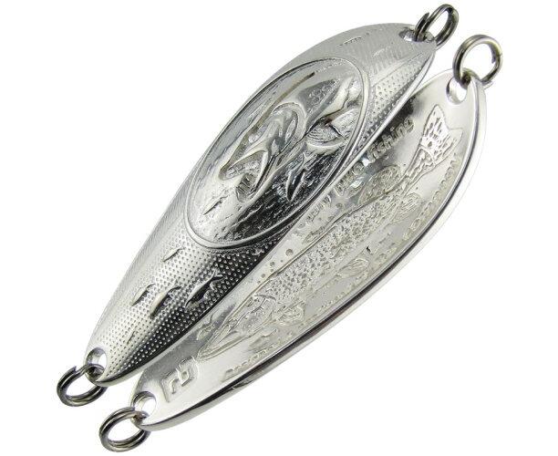 "Акустически" эта блесна намного "крупнее", чем визуально. Рельефное изображение на выпуклой стороне призвано расширить спектр колебаний, а вовсе не поразить щуку видом атакующего конкурента.