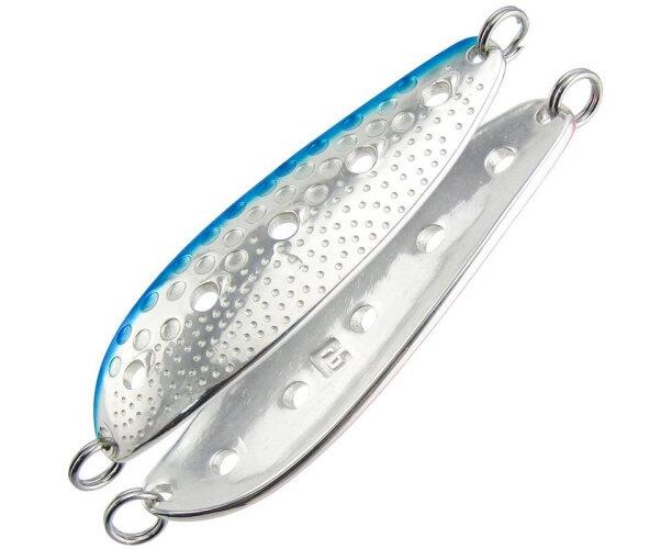 Блесна создана для ловли прежде всего пелагического хищника в больших объемах воды - в морях, озерах, крупных реках. Поэтому ставка сделана не на ЗАМЕТНОСТЬ блесны, а на ее ШУМНОСТЬ. Колебания, создаваемые приманкой, далеко разносятся под водой и собирают активного хищника с больших расстояний. В то же время, спектр колебаний блесны воздействует и на пассивного хищника, раздражая его и побуждая к атаке.