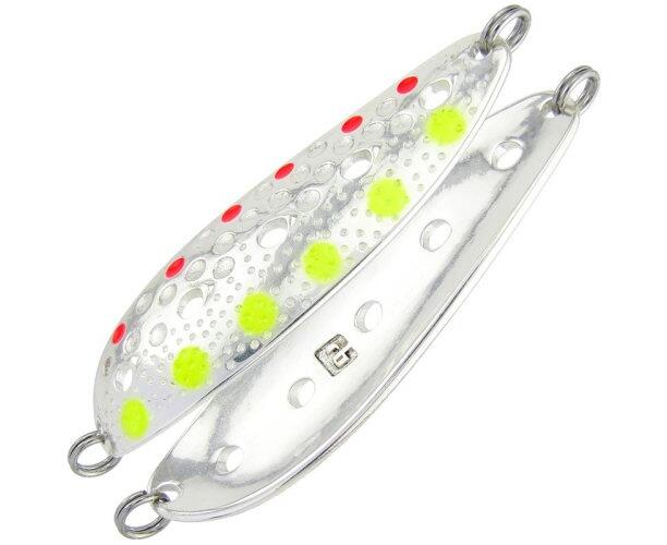Блесна работает в широком диапазоне скоростей проводки, а также при ловле в отвес, допускает активную анимацию. Как следствие - добычей становятся не только лососи, но и жерех, судак, сом - на юге, озерный голец Таймыра и Кольского полуострова, жерех и щука на больших водохранилищах. Ловля в заброс, троллингом и в отвес - как зимой, так и летом - всегда эта блесна окажется на высоте!