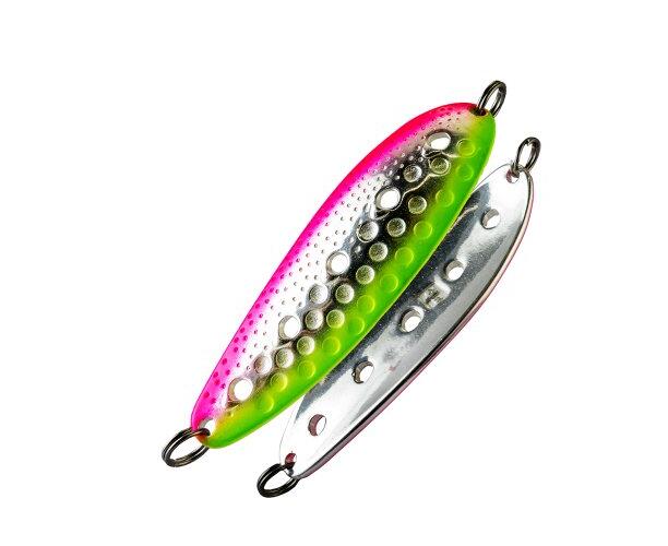Блесна работает в широком диапазоне скоростей проводки, а также при ловле в отвес, допускает активную анимацию. Как следствие - добычей становятся не только лососи, но и жерех, судак, сом - на юге, озерный голец Таймыра и Кольского полуострова, жерех и щука на больших водохранилищах. Ловля в заброс, троллингом и в отвес - как зимой, так и летом - всегда эта блесна окажется на высоте!