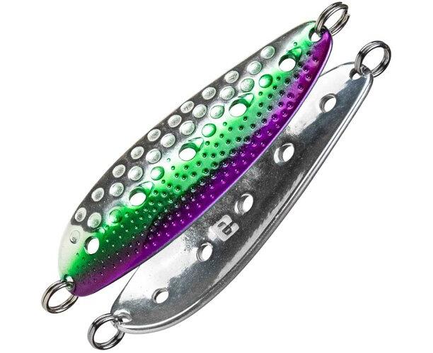 Блесна работает в широком диапазоне скоростей проводки, а также при ловле в отвес, допускает активную анимацию. Как следствие - добычей становятся не только лососи, но и жерех, судак, сом - на юге, озерный голец Таймыра и Кольского полуострова, жерех и щука на больших водохранилищах. Ловля в заброс, троллингом и в отвес - как зимой, так и летом - всегда эта блесна окажется на высоте!