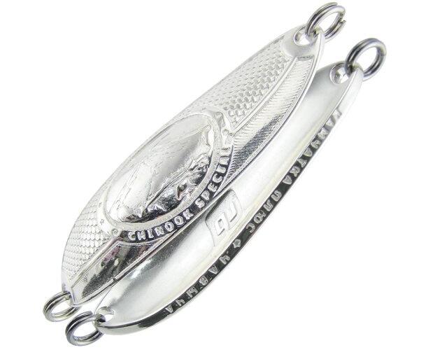 Первая блесна для Чавычи (Чинук) имеет гладкую внутреннюю поверхность, поскольку от внутренней, вогнутой поверхности в значительной степени зависят игра блесны. Поперечная изогнутость блесны выполнена по эллипсу, а не по радиусу, как на подавляющем большинстве ШТАМПОВАННЫХ блёсен. Продольная кривая выгнутости имеет небольшую S-образность, причем кормовая часть продольного профиля выполнена по методу BEEGLE CURVE (по-русски данное семейство кривых у математиков называется собачья кривая). По таким кривым строится большинство авиационных профилей.