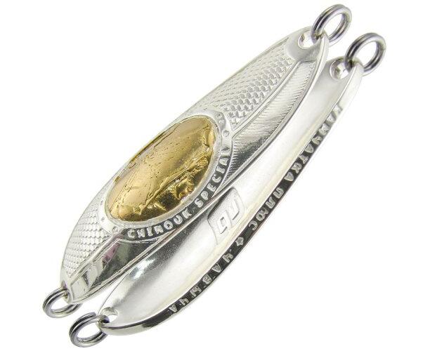 Первая блесна для Чавычи (Чинук) имеет гладкую внутреннюю поверхность, поскольку от внутренней, вогнутой поверхности в значительной степени зависят игра блесны. Поперечная изогнутость блесны выполнена по эллипсу, а не по радиусу, как на подавляющем большинстве ШТАМПОВАННЫХ блёсен. Продольная кривая выгнутости имеет небольшую S-образность, причем кормовая часть продольного профиля выполнена по методу BEEGLE CURVE (по-русски данное семейство кривых у математиков называется собачья кривая). По таким кривым строится большинство авиационных профилей.