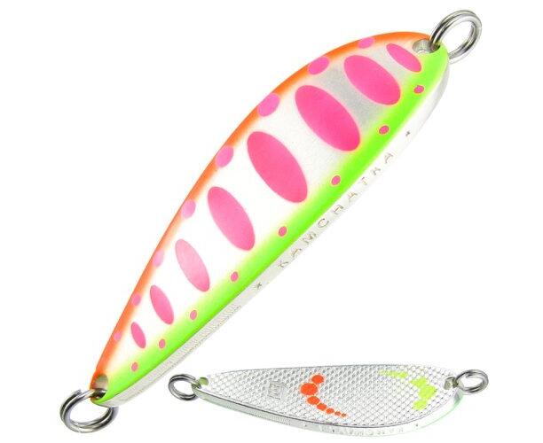 Однако ошибкой будет полагать, что "Камчатка" способна ловить только в дальневосточных морях и только тихоокеанских лососей. Прибрежная рыбалка на глубоких карельских озерах, на Белом, Баренцевом или Балтийском побережье будет не менее удачна. Гольцы и лососи всех видов прекрасно реагируют на равномерную в среднем темпе подачу этой блесны. Да и щука, конечно же не пропустит мимо "Камчатку".