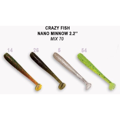 Nano Minnow от торговой марки Crazy Fish – это мягкая приманка типа виброхвост, имитирующая маленькую рыбку или малька. Приманка обладает тонким практически гладким подвижным телом, плавно переходящим в хвост с пяткой на конце. Сочетания небольшого размера приманки с ее высокочастотной игрой делает ее идеальной для охоты на окуня, однако не редки случаи, когда при помощи этого малыша удавалось поймать весьма внушительный трофей в виде судака или щуки, а так же мирной рыбы. Nano Minnow выпускается в шести различных аттрактантах, среди которых: креветка, кальмар, анис, жареный чеснок, рыба и жареная рыба, а так же в различных эффективных расцветках, позволяющих использовать ее в различных условиях.