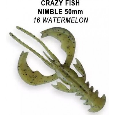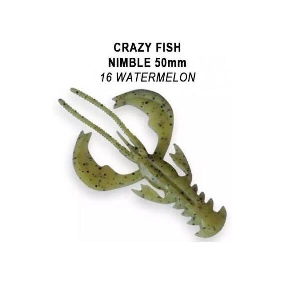 Приманка имитирует речного рака, который является одним из основных объектов питания крупного окуня. Crazy Fish Nimble отличается очень мощной игрой и благодаря активным клешням включается в работу уже на падении. Уникальная форма тела позволяет использовать шарнирные монтажи как с открытым, так и с офсетным крючком. Допускается также использование классической джиг-головки. На подгруженном офсете приманка тонет по спирали, вкусно поигрывая клешнями.