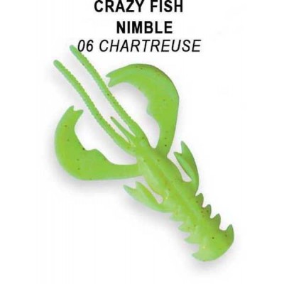 Приманка имитирует речного рака, который является одним из основных объектов питания крупного окуня. Crazy Fish Nimble отличается очень мощной игрой и благодаря активным клешням включается в работу уже на падении. Уникальная форма тела позволяет использовать шарнирные монтажи как с открытым, так и с офсетным крючком. Допускается также использование классической джиг-головки. На подгруженном офсете приманка тонет по спирали, вкусно поигрывая клешнями.