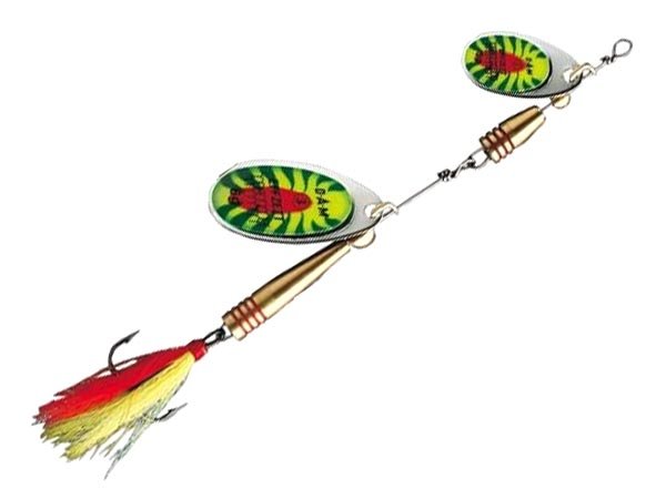 Эта блесна оборудована двумя вращающимися лопастями, которые создают заманчивые вибрации и манящее движение в воде, что делает её особенно привлекательной перед рыбой. Комбинация двух лопастей обеспечивает увеличенное колебание и эффективность приманки, что делает её более заметной и привлекательной для хищной рыбы.
