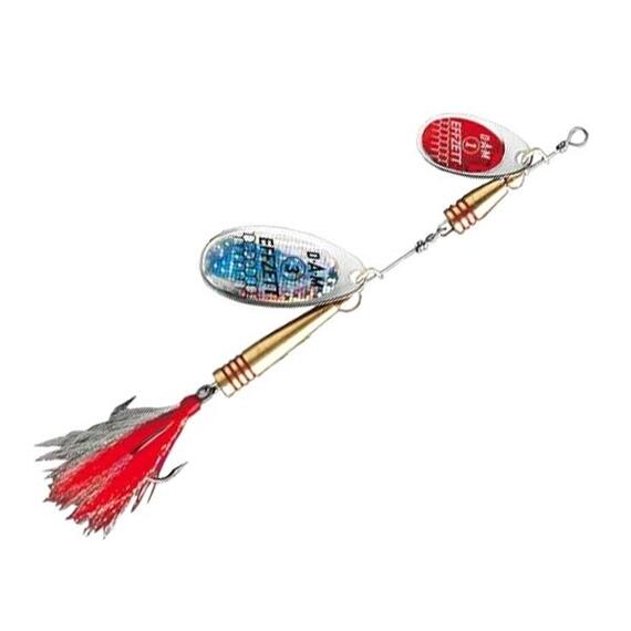 Эта блесна оборудована двумя вращающимися лопастями, которые создают заманчивые вибрации и манящее движение в воде, что делает её особенно привлекательной перед рыбой. Комбинация двух лопастей обеспечивает увеличенное колебание и эффективность приманки, что делает её более заметной и привлекательной для хищной рыбы.