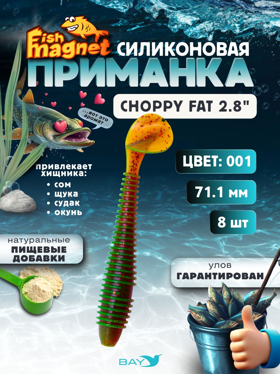 Fish Magnet CHOPPY FAT 2.8″ — это мощная съедобная виброприманка, выполненная из мягкого силикона с добавлением пищевых ароматизаторов, которые увеличивают количество уверенных атак хищника.