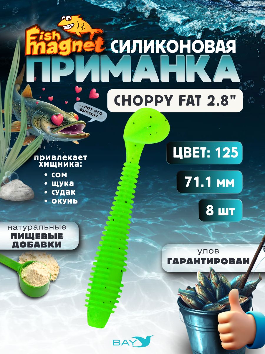 Fish Magnet CHOPPY FAT 2.8″ — это мощная съедобная виброприманка, выполненная из мягкого силикона с добавлением пищевых ароматизаторов, которые увеличивают количество уверенных атак хищника.