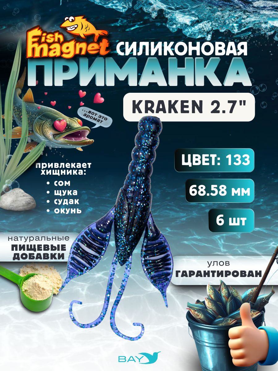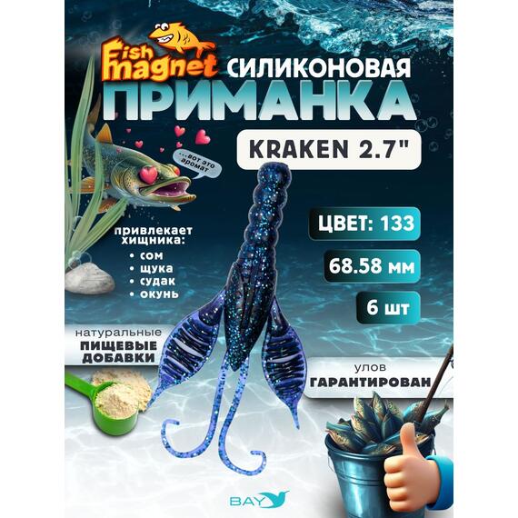Fish Magnet KRAKEN – это не просто силиконовая приманка, а уникальная авторская разработка для результативной рыбалки. Ее форма сочетает в себе признаки кольчатого червя и рака, что делает ее максимально привлекательной для хищной рыбы, которая ищет нестандартную и аппетитную добычу.