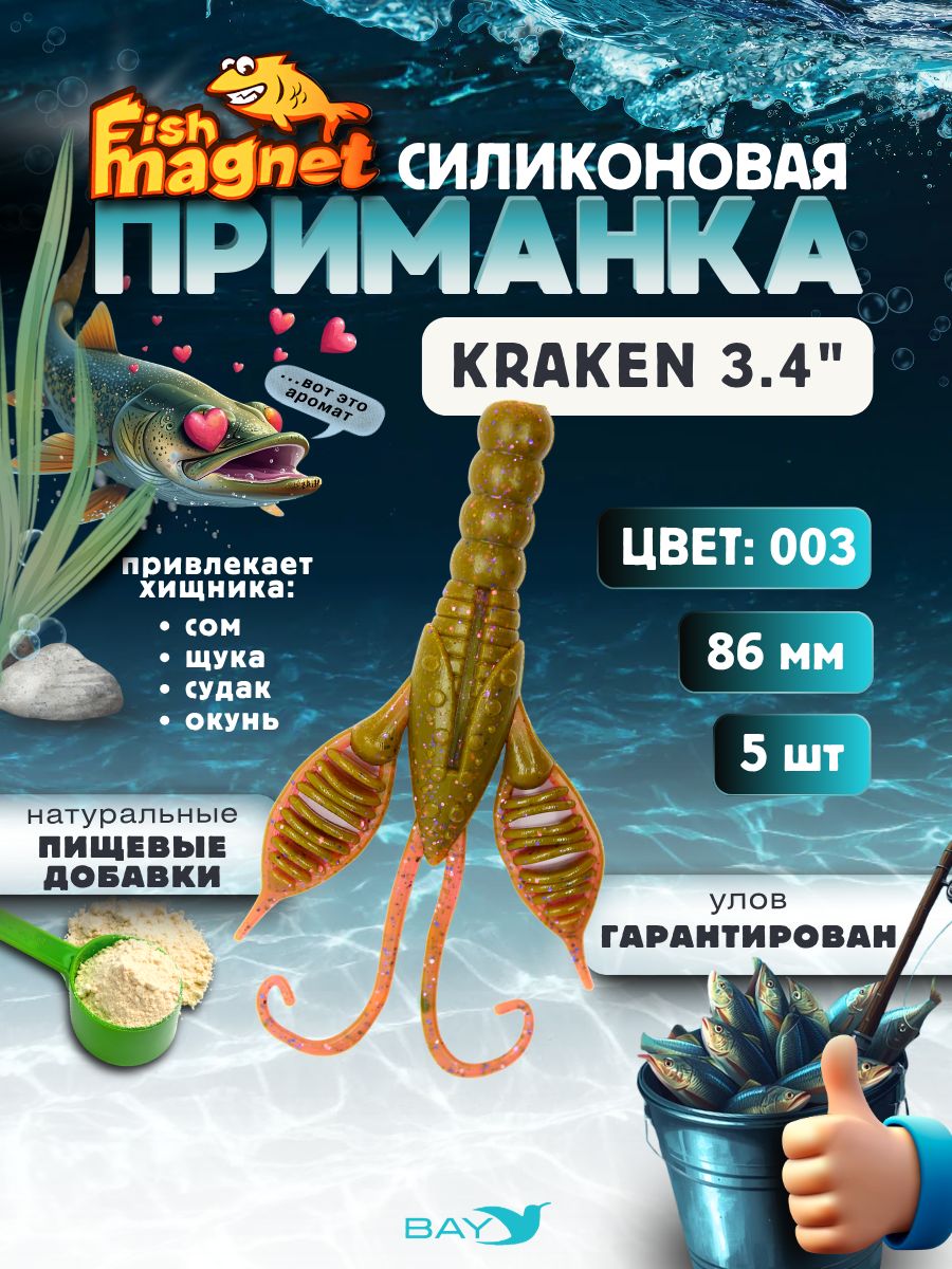 Fish Magnet KRAKEN – это не просто силиконовая приманка, а уникальная авторская разработка для результативной рыбалки. Ее форма сочетает в себе признаки кольчатого червя и рака, что делает ее максимально привлекательной для хищной рыбы, которая ищет неста