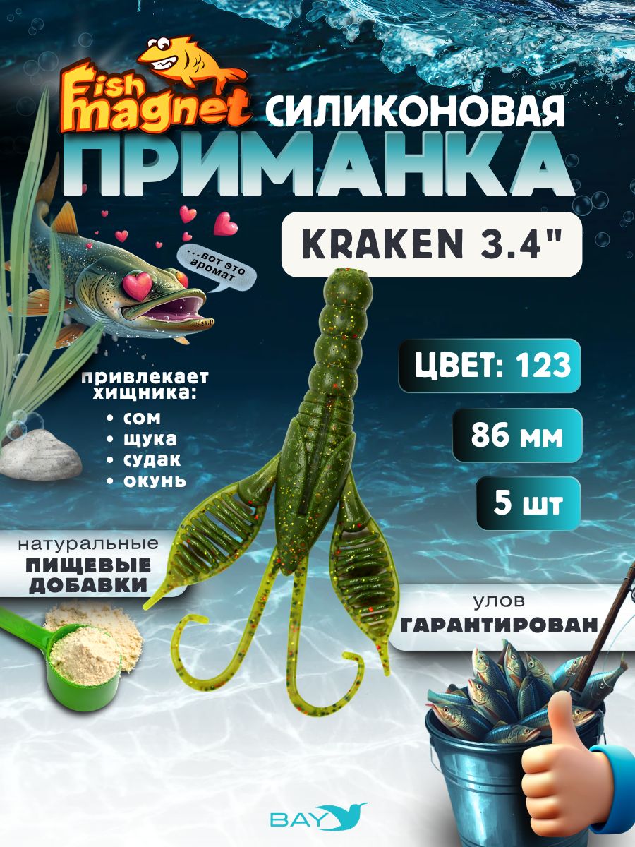 Fish Magnet KRAKEN – это не просто силиконовая приманка, а уникальная авторская разработка для результативной рыбалки. Ее форма сочетает в себе признаки кольчатого червя и рака, что делает ее максимально привлекательной для хищной рыбы, которая ищет неста