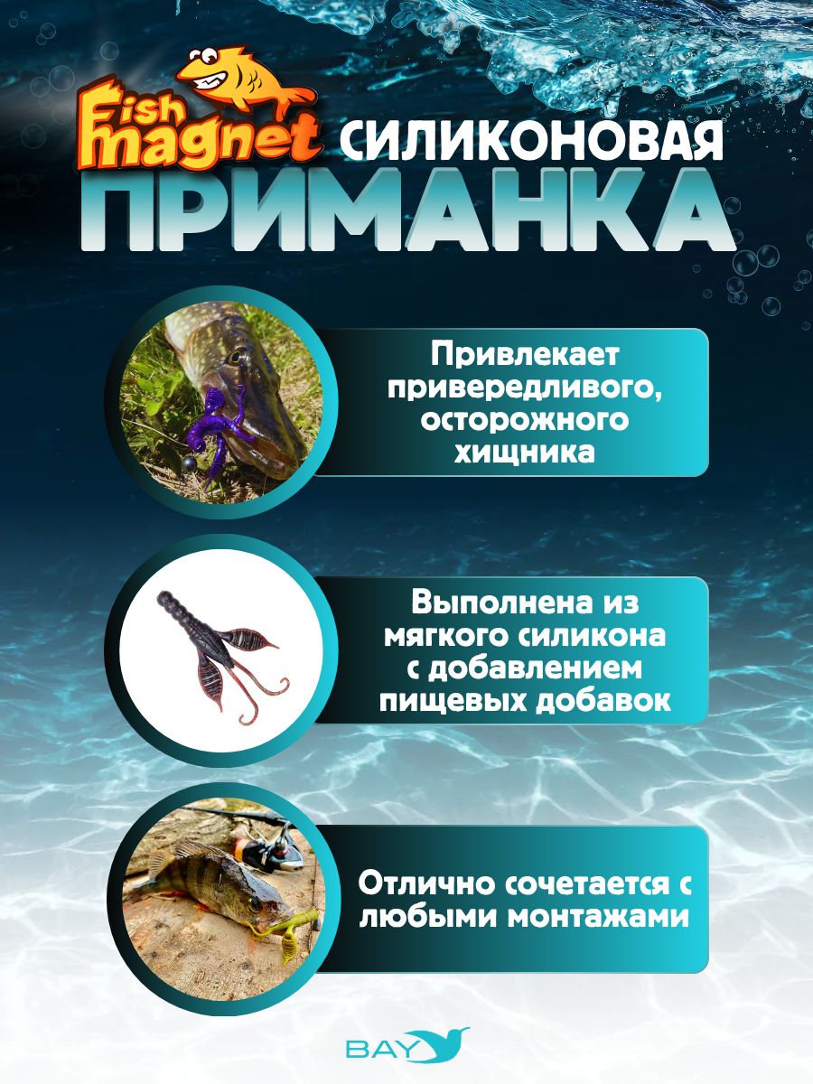 Fish Magnet KRAKEN – это не просто силиконовая приманка, а уникальная авторская разработка для результативной рыбалки. Ее форма сочетает в себе признаки кольчатого червя и рака, что делает ее максимально привлекательной для хищной рыбы, которая ищет неста