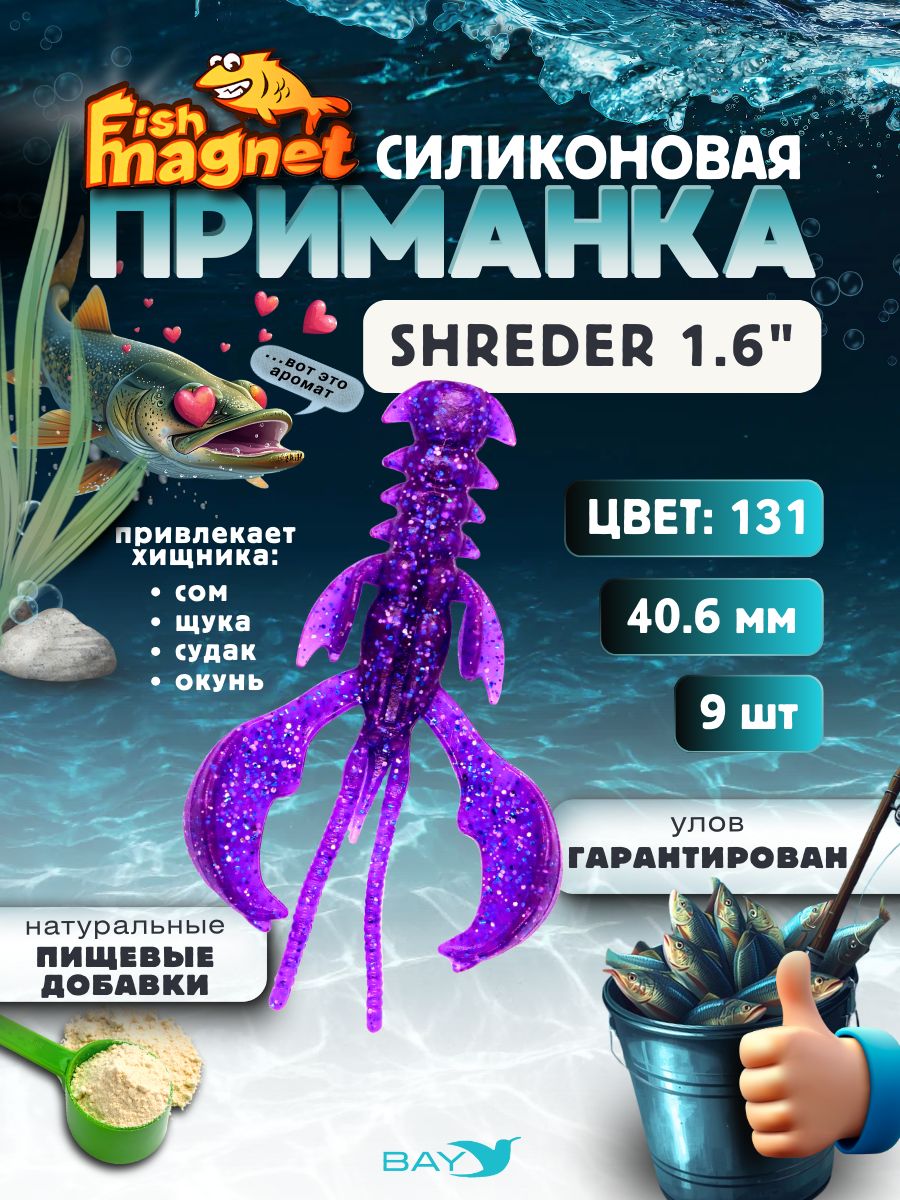 Силиконовая приманка Fish Magnet SHREDER выполнена из мягкого силикона с добавлением пищевых добавок, представляющая собой имитацию рака с очень активной игрой клешнями, которые после попадания в водоём сразу начинают попеременно или синхронно колебаться даже во время одной проводки в зависимости от потоков воды. Этот эффект оживляет приманку, провоцирую хищника на атаку.Приманка работает на всех стадиях проводки, в том числе при медленном свободном падении, «вкусно» размахивая лапами и покачивая всем телом, она очень активна на подъеме приманки и конечно же в толще воды, при равномерной проводке.Наилучший результат приманка показывает на классических джиговых монтажах с джиг-головкой или «чебурашкой», но благодаря боковым лапам-стабилизаторам и выверенной геометрии тела, с огромным успехом применяется и на неогруженных монтажах с открытым крючком или офсетом. Отводной поводок, Dropshot, Carolina rig, Texas rig — это его стихия.