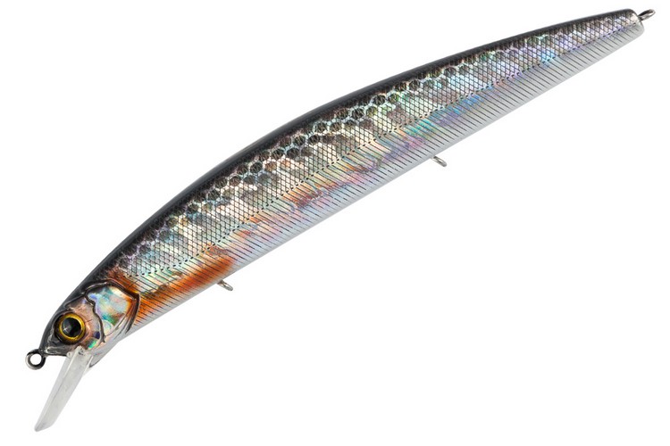 Воблер TsuYoki CHANCE 130SP Крупный минноу нейтральной плавучести для ловли на глубинах до 3-5 метров над бровками, коряжниками и кормовыми поливами. Особенности дизайна: CHANCE 130 SP имеет две, разделенные боковой линией, рельефные фактуры поверхности. Верхняя часть выполнена в виде ромбовидных насечек, нижняя- в виде косых насечек. Головная часть воблера имитирует голову кормовой рыбки, а крупные вклеенные 3D глаза завершают реалистичный дизайн приманки. CHANCE 130 SP оснащен системами дальнего заброса, баланса, а так же имеет шумовую камеру, создающую акустическое сопровождение анимации. Воблер вооружен тремя тройниками соответствующего размера, силовой фурнитурой и заводными кольцами. Широкая карта цветов в каталоге и качественное ЛКП, соответствующее современным стандартам. Заброс и анимация : CHANCE 130 SP, несмотря на внушительный размер, улетал при тестах к отметкам в районе 40 метров. Тесты на дальность проводились с удилищем длиной 7,8 фута быстрого строя , тест 12- 38 гр, катушка 4000, шнур #1,2. Такая дальность заброса и наличие шумового сопровождения позволяет отнести CHANCE 130 SP к разряду поисковых воблеров, способных за короткий период облавливать большие площади акватории и эффективно находить активного хищника. CHANCE 130 SP при равномерной проводке имеет выраженную собственную игру, активно раскачиваясь с боку на бок и виляя хвостовой частью, что является дополнительным плюсом, учитывая поисковую направленность приманки. При проводке стоп-энд-гоу CHANCE 130 SP на активной фазе роллингует, и устойчиво зависает в паузе, покачивая боками. При рывковой анимации CHANCE 130 SP нужно использовать рывки различной амплитуды. Воблер очень отзывчив на манипуляции удилищем и позволяет выполнить филигранную анимацию. Учитывая его шумность, по активному хищнику можно использовать достаточно резкие рывки. А вот при ловле по холодной воде над бровками лучше начинать ловлю с мягких рывков-протяжек и контролировать паузы. При всех видах рывковой проводки CHANCE 130 SP заметно отклоняется от оси проводки( до 90 градусов), заметно роллингует и бликует боками. В начальной фазе паузы демонстрирует хорошо заметные остаточные колебания. Основным целевым трофеем для CHANCE 130 SP будет щука, причем можно рассчитыватьна встречу с по настоящему трофейными хищниками. Применение поводка # 2 длиной 25-30 см обязательно и не оказывает влияния на анимацию. Комплект снастей: удилище длиной 7,0- 7,8 фута быстрого строя , с тестом до 35-42 гр, катушка 3000-4000 (по японской шкале), шнур #1,2-1,5. Минноу Суспендер (SP) 130 мм 21,5 гр Заглубление 0,8-1,8 м