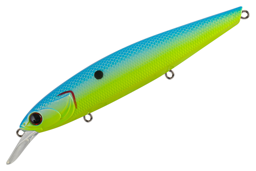 Воблер TsuYoki DRAGA 130SP Bоблер DRAGA 130SP обладает внушительными физическими габаритами, и по этому показателю и по способности воблера подымать хищника с больших глубин,мы относим DRAGA 130SP TsuYoki к классу big-minnow. Внутренние устройство воблера представляет из себя систему, состоящею из нескольких стальных шаров. Часть из них ограниченно перемещаются внутри воблера,они отвечают за балансировку и придают воблеру остаточные колебания на паузах. Один шар, отвечающий за дальность заброса, свободно катается по самому длинному каналу. В момент заброса он скатывается в хвост воблера и находится там в течение всей фазы полета. При приводнение, после первой потяжки, шар перемещается в головную часть воблера, где и находится все время проводки. Из-за того, что DRAGA 130SP не имеет магнитной системы заброса и балансировки, мы рекомендуем производить заброс с длинного свиса -70-80 сантиметров и плавного разгона приманки. При таком способе заброса в полете воблер ведет себя стабильно. Спектр рекомендуемых проводок данной модели довольно широк, нет смысла подробно разбирать каждую из них,отметим только, что не смотря на то, что воблер DRAGA 130SP не упорист, мы все же рекомендуем при работе с ним использовать удилища быстрого и сверх быстрого строя, соответствующего теста. Мы предполагаем, что добычей данной модели будут щука и крупный окунь, в меньшей степени-судак. Воблер оснащен качественными тройниками , комплектом силовых колец. Широкая цветовая гамма модели позволит Вам подобрать воблер, под любые условия ловли. Минноу Суспендер (SP) 130 мм 24,3 гр Заглубление 0,2-1,8 м