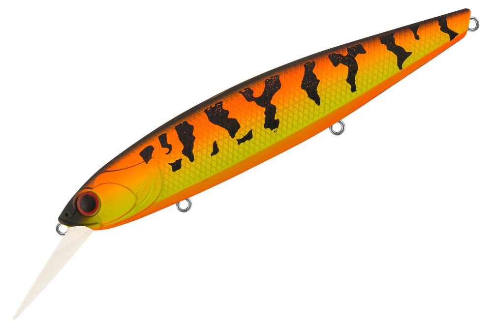 Воблер TsuYoki DRAGA MR 130SP Крупный минноу для ловли на глубинах до 3,0 метров, над коряжниками и на кормовых поливах. Особенности дизайна: Фактура поверхности DRAGA 130SP выполнена глубокими ромбовидными насечками, имитирующими чешую. Головная часть – рельефно, со всеми подробностями, выполненная голова рыбки. Вклеенные 3 D глаза завершают реалистичность дизайна DRAGA 130SP. Воблер имеет систему дальнего заброса и баланса, и оснащен тремя тройниками соответствующего размера и мощности. Фурнитура приманки силовая, заводные кольца прокованные, для придания им дополнительной прочности. Высококачественное лако-красочное покрытие. Заброс и анимация: Благодаря солидному весу (25,2 гр),системе дальнего заброса и неплохой геометрии DRAGA 130SP улетает на 35+ метров. В тесте на дальность использовался комплект: удилище 7,8 фута быстрого строя с тестом до 32 гр. Катушка 3000 по линейке Шимано. Шнур #1,2. Работа с DRAGA 130SP должна включать в себя все элементы анимации, применимые для воблеров класса минноу. На равномерной проводке воблер имеет свою собственную, очень интересную и выразительную, игру. Поэтому этот вид анимации нужно обязательно использовать при ловле на DRAGA 130SP. Чередование равномерной проводки с паузами, а так же длинные протяжки с паузами ( вариации стоп-энд-гоу) – прекрасный способ анимации для этой приманки. При рывковой анимации DRAGA 130SP прекрасно реагирует на рывковую проводку различной степени интенсивности. Подобрать тот вариант, который сегодня окажется неотразим для хищника – дело самого рыболова. После рывка и завершения разворота (90+ градусов ) воблер демонстрирует покачивание боками (роллинг). Во время самого рывка,в активной фазе движения, мощно играет, бликует, показывая бока. Минноу Суспендер (SP) 130 мм 25,5 гр Заглубление 1,8-2,5 м