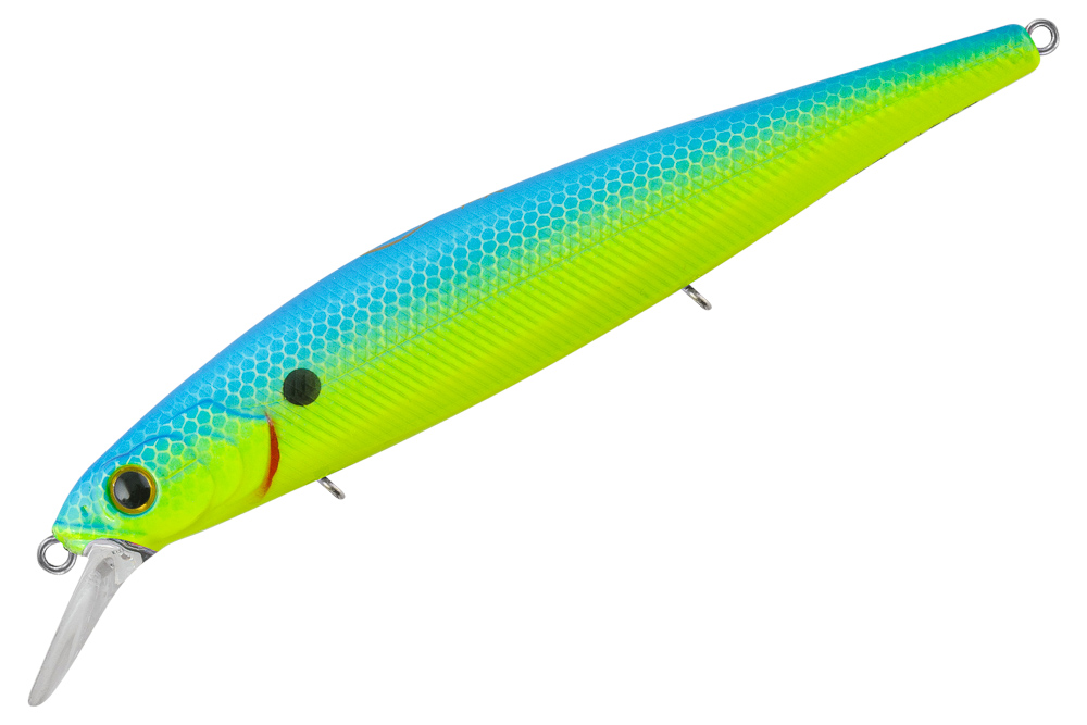 Воблер TsuYoki FLIRT 115SP Средне-размерный минноу нейтральной плавучести для ловли на глубинах 2-2,5 метра. Особенности дизайна: FLIRT 115SP имеет две, разделенные боковой линией, рельефные фактуры поверхности. Верхняя часть (спинка и бока) выполнена в виде ромбовидных насечек - чешуек, нижняя (вплоть до брюшка) в виде косых насечек. Головная часть воблера рельефно имитирует жаберные крышки. Объемные 3D глаза завершают реалистичный дизайн приманки. FLIRT 115SP имеет систему дальнего заброса и баланса , а так же встроенную шумовую камеру с мелкими шелестящими шариками. Приманка оснащена тремя тройниками VMC BN. Качество лако-красочного покрытия соответствует всем современным требованиям. Заброс и анимация: Благодаря системе дальнего заброса и общей геометрии FLIRT 115SP летит на 35+ метров. Тесты на дальность проводились с комплектом: Удилище длиной 8 фута быстрого строя (Fast), тест 5-21 гр, катушка магниевый корпус 3000 по линейке Шимано, шнур #1,2. При работе с FLIRT 115SP нужно использовать весь арсенал проводок, от равномерной до рывковой. На равномерной проводке воблер имеет очень приятную широкоамплитудную, и при этом низкочастотную собственную игру. При использовании стоп энд гоу (протяжка с с паузой или несколько оборотов катушки с паузой) воблер в паузе медленно всплывает, немного покачиваясь. На самой протяжке бликует и немного показывает бока. На рывковой анимации FLIRT 115SP ведет себя очень отзывчиво и послушно. Если анимировать его короткими, но достаточно резкими рывками, то воблер разворачивается на 90+ градусов практически на месте, в момент самого рывка активно показывает бока. На одном обороте катушки можно выполнить два рывковых цикла (по 2 рывка) с паузой. Если делать рывок более мягким и продолжительным, то воблер ,чуть меньше разворачиваясь, скользит в сторону от оси проводки. При этом роллинг и блики имеют место быть. В общем, поле для экспериментов и творчества в рывковой анимации FLIRT 115SP обширно, и каждый найдет для себя самый уловистый вариант твичинга. При всех вариантах анимации воблер отлично держит заданный горизонт заглубления. Наше мнение - FLIRT 115SP отличный воблер для охоты за щукой над коряжниками и кормовыми поливами. Будет востребован и при ночной ловле судака. С поводком 12 см #1 FLIRT 115SP медленно всплывает (SF). Если применять более длинный и мощный поводок (струна #2 длинной 20 см) , воблер станет чистым суспендером. Наличие поводка на анимацию влияния не оказывает. Комплект снастей: Удилище длиной 7,0-8,0 фута быстрого строя , тест до 25-30 гр, катушка 3000 по линейке Шимано, шнур #1,2. Миноу Суспендер (SP) 115 мм 16,5 гр Заглубление 1,0-1,8 м