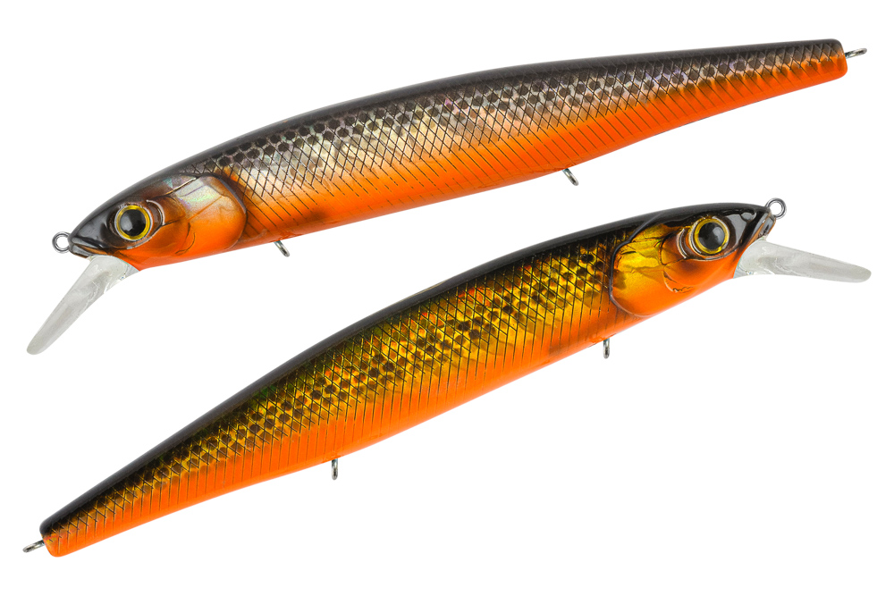 Воблер TsuYoki FLIRT 128SP. Биг - минноу нейтральной плавучести для ловли на глубинах 2.0 - 4.5 метра. Особенности дизайна: FLIRT 128SP имеет две, разделенные боковой линией, рельефные фактуры поверхности. Верхняя часть (спинка и бока) выполнена в виде ромбовидных насечек - чешуек, нижняя (вплоть до брюшка) в виде косых насечек. Головная часть воблера рельефно имитирует жаберные крышки. Объемные 3D глаза завершают реалистичный дизайн приманки. FLIRT 128SP имеет систему дальнего заброса и баланса , а так же встроенную шумовую камеру с мелкими шелестящими шариками. Приманка оснащена тремя тройниками Owner Cultiva. Качество лако-красочного покрытия соответствует всем современным требованиям. Заброс и анимация: Благодаря системе дальнего заброса и общей геометрии FLIRT 128SP летит на +42 метров. Тесты на дальность проводились с комплектом: Удилище длиной 8 фута быстрого строя (Fast), тест 12 - 32 гр, катушка магниевый корпус 3000 по линейке Шимано, шнур #1,2. При работе с FLIRT 128SP нужно использовать весь арсенал проводок, от равномерной до рывковой. На равномерной проводке воблер имеет очень приятную широкоамплитудную, и при этом низкочастотную собственную игру. При использовании стоп энд гоу (протяжка с с паузой или несколько оборотов катушки с паузой) воблер в паузе медленно всплывает, немного покачиваясь. На самой протяжке бликует и немного показывает бока. На рывковой анимации FLIRT 128SP ведет себя очень отзывчиво и послушно. Если анимировать его короткими, но достаточно резкими рывками, то воблер разворачивается на 90+ градусов практически на месте, в момент самого рывка активно показывает бока. На одном обороте катушки можно выполнить два рывковых цикла (по 2 рывка) с паузой. Если делать рывок более мягким и продолжительным, то воблер ,чуть меньше разворачиваясь, скользит в сторону от оси проводки. При этом роллинг и блики имеют место быть. В общем, поле для экспериментов и творчества в рывковой анимации FLIRT 128SP обширно, и каждый найдет для себя самый уловистый вариант твичинга. При всех вариантах анимации воблер отлично держит заданный горизонт заглубления. Наше мнение - FLIRT 128SP отличный воблер для охоты за щукой над коряжниками и кормовыми поливами. С поводком 15 см #1 FLIRT 128SP медленно всплывает (SF). Если применять более длинный и мощный поводок (струна #2 длинной 20 см) , воблер станет чистым суспендером. Наличие поводка на анимацию влияния не оказывает. Для ловли данным воблером мы рекомендуем такой комплект снастей: Удилище длиной 7,0-8,0 фута быстрого строя , тест до 25-30 гр, катушка 3000 по линейке Шимано, шнур #1,2. Минноу Суспендер (SP) 128 мм 22,7 гр Заглубление 1,4-1,8 м