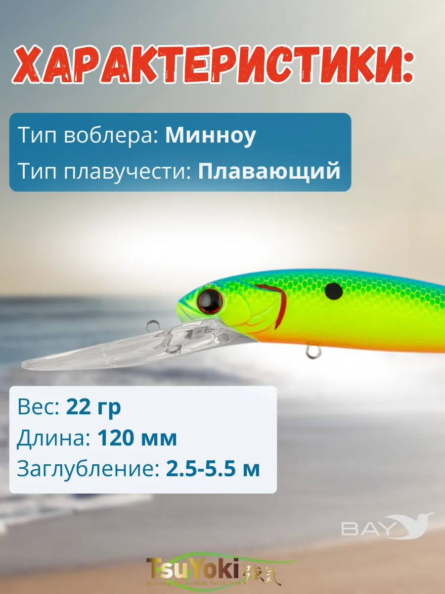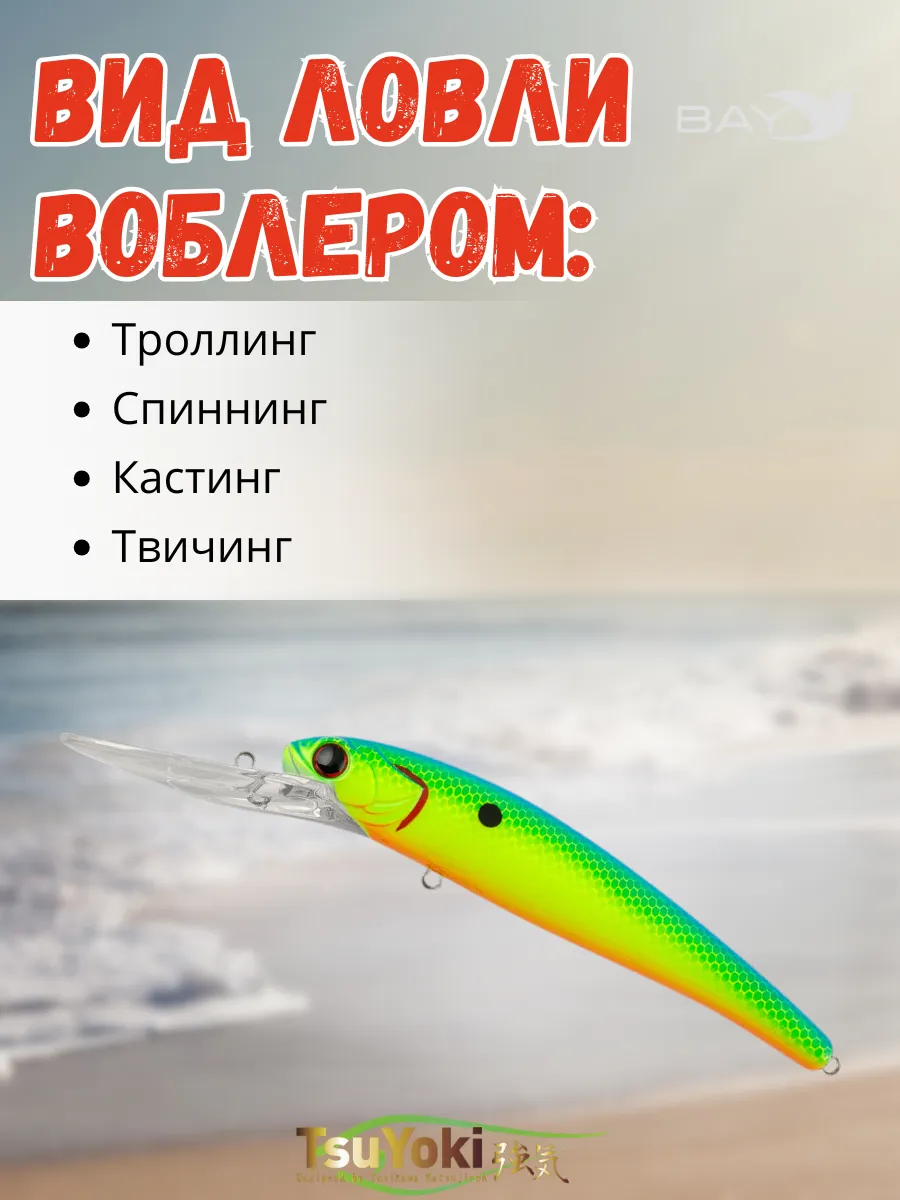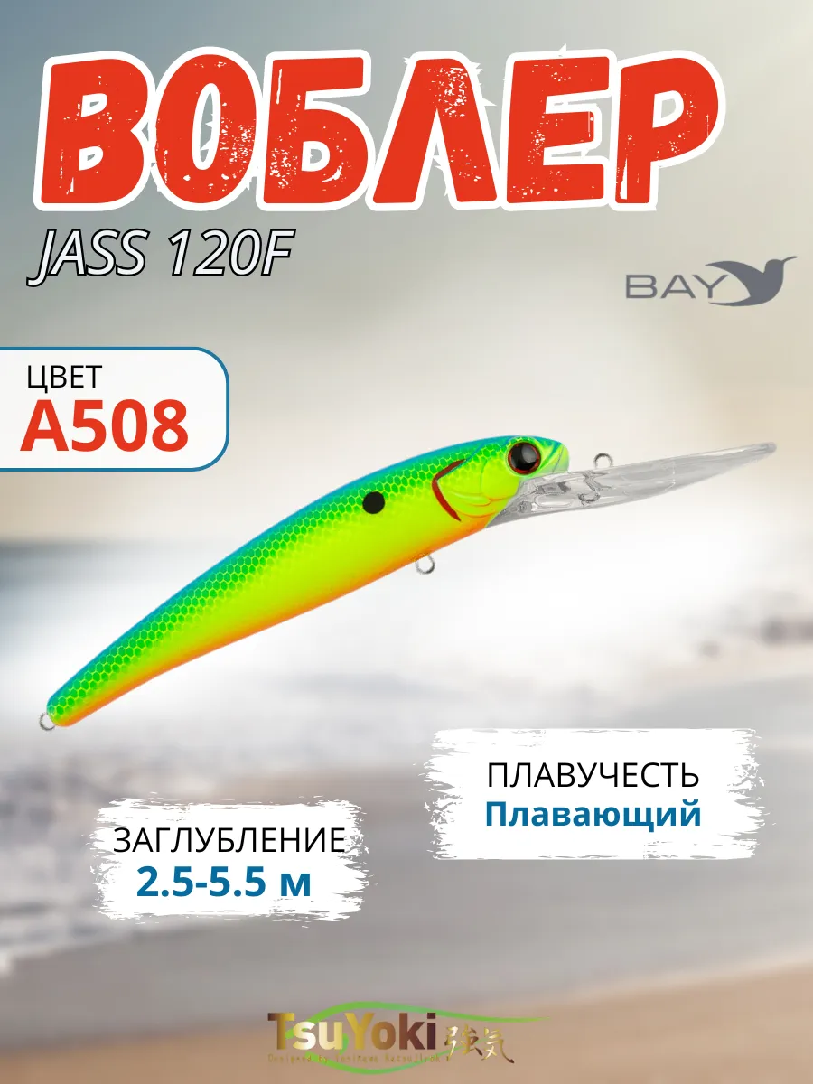 Воблер TsuYoki JASS 120F предназначен для ловли такой трофейной рыбы как судак, щука, сом методом троллинг. При отпуске шнура ( 0.2 мм ) около 40 -метров и скорости катера 3.5 - 4.0 км / час воблер заглубляется глубже 6 метров, показывая при этом малоамплитудную высокочастотную игру, характерную для приманок хорошо работающих по судаку. Наилучших результатов воблер добивается, если во время проводки он будет время от времени касаться дна, выбивая муть со дна. Не надо бояться зацепов при этом. Широкая и прочная лопата надежно защитит крючки воблера.
