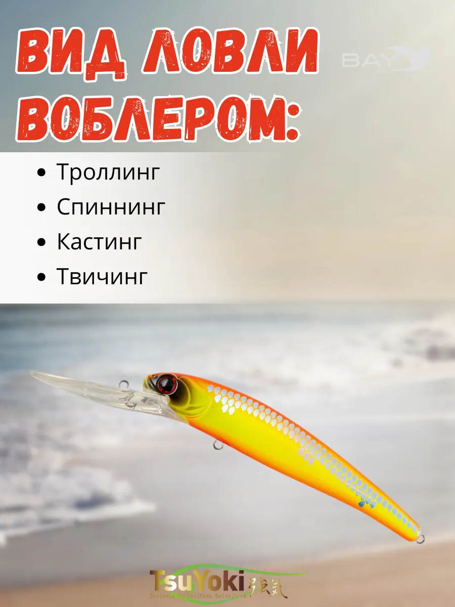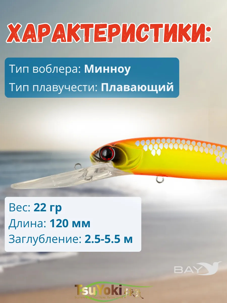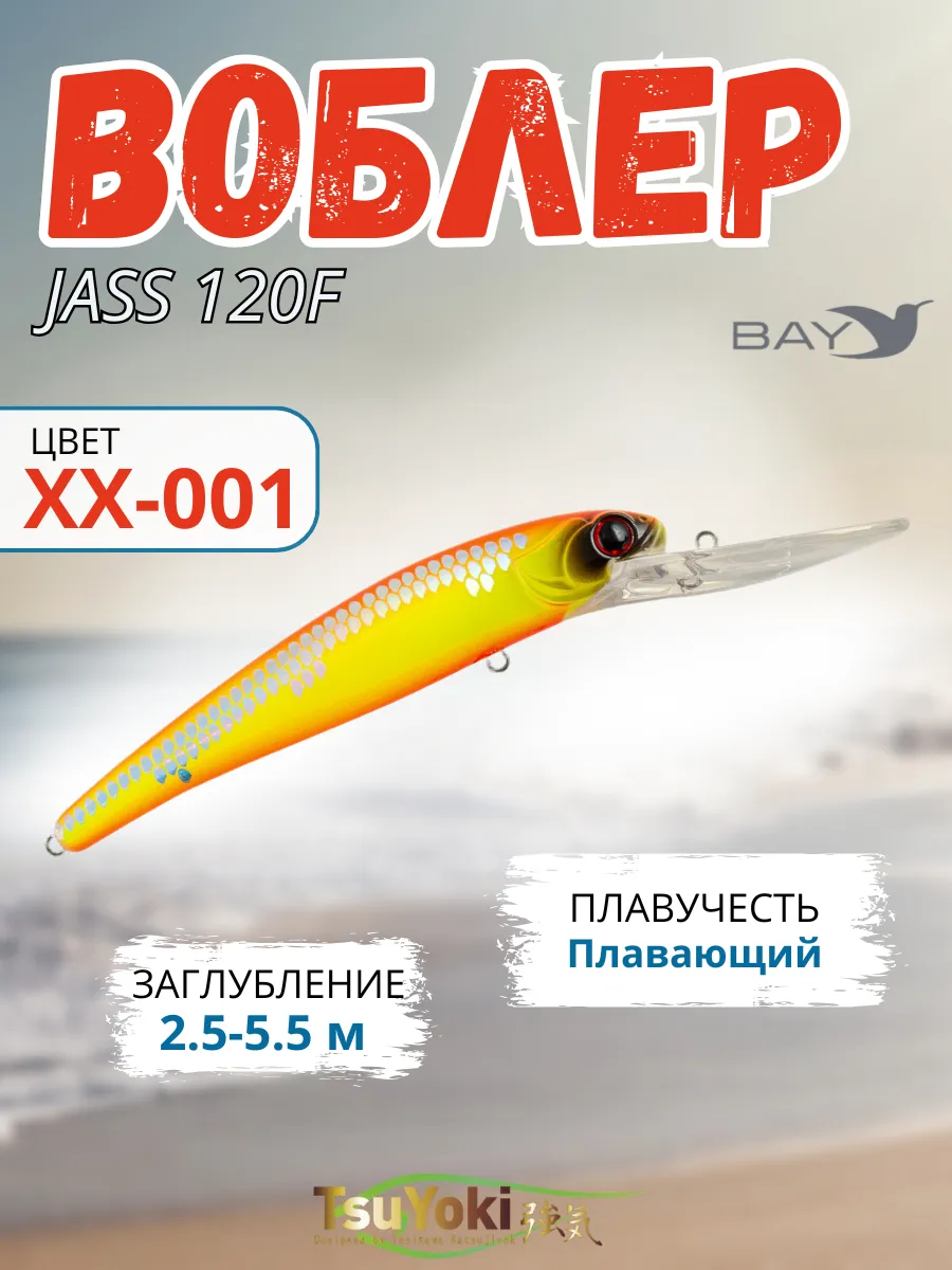 Воблер TsuYoki JASS 120F предназначен для ловли такой трофейной рыбы как судак, щука, сом методом троллинг. При отпуске шнура ( 0.2 мм ) около 40 -метров и скорости катера 3.5 - 4.0 км / час воблер заглубляется глубже 6 метров, показывая при этом малоамплитудную высокочастотную игру, характерную для приманок хорошо работающих по судаку. Наилучших результатов воблер добивается, если во время проводки он будет время от времени касаться дна, выбивая муть со дна. Не надо бояться зацепов при этом. Широкая и прочная лопата надежно защитит крючки воблера.