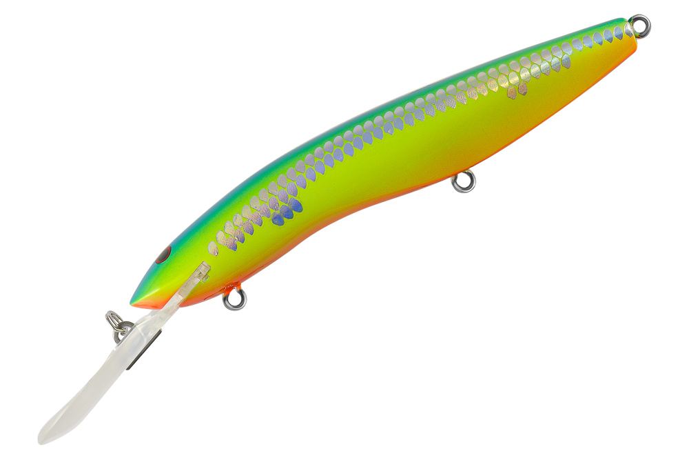 Воблер TsuYoki MITO 125F Крупный минноу для ловли троллингом на неоднородном рельефе и свалах с глубинами 3-10 метров. Основные трофеи – судак, щука, сом. Особенности дизайна: MITO 125F имеет полностью гладкую поверхность. Воблер имеет шумовую камеру, шары которой стучат при колебаниях приманки на проводке, создавая дополнительный фактор привлечения для хищников. Воблер оснащен мощной фурнитурой, силовыми заводными кольцами и тремя могучими тройниками. В комплекте поставки три сменные лопасти для ловли на глубинах 3-5-9 метров. Общее исполнение воблера и его ЛКП на высоком современном уровне. В каталоге широкий выбор расцветок. Анимация: Согласно профильной статьи в Википедии «Троллинг — метод рыбной ловли с движущегося моторизованного плавсредства (лодка, катер). Суть метода заключается в осуществлении проводки приманки путём её буксирования с помощью моторной лодки или катера.» При проводке MITO 125F выдает мощные колебания, издалека привлекая хищников и провоцируя их на поклевку. Выбор места для ловли троллингом – основной момент, влияющий на конечный результат рыбалки. Наиболее правильным будет облов бровок с глубинами, соответствующими рабочему диапазону MITO 125F, как с движением катера против течения, так и по течению. Так же огромный интерес представляют поливы с неоднородным рельефом (буграми и приямками) и наличием редких коряг, являющихся идеальным укрытием для хищников. Через сами коряги маршрут прокладывать не стоит, но пройти недалеко от нее непременно нужно. Контроль дна при такой ловле обязателен. Только если воблер с некоторой периодичностью задевает лопастью дно, вы можете быть уверены, что длина отпуска приманки и скорость движения катера правильные. Огромный плюс MITO 125F – наличие сменных лопастей, придающих воблеру разные горизонты заглубления. С MITO 125F можно успешно облавливать разнообразные места водоема с глубинами от 3+ до 9+ метров… Троллинг – хороший помощник в поиске активной рыбы. В случае повторяющихся поклевок в одном и том же месте маршрута, стоит уделить данной локации самое пристальное внимание. Возможно, обловив точку взаброс джиговыми или другими приманками. Поводок при ловле троллингом обязателен. Желательно, чтобы он был не менее 40 см. Такая длина поводка защитит приманку при поклевках щуки на опережение, а так же при прохождении бровок и бугров, обросших ракушками. Чтобы не было обидных потерь приманок на зацепах, в лодке обязательно должен быть тяжелый глубоководный отцеп с достаточным количеством шнура. Наиболее применимы для троллинга мультипликаторные катушки и спиннинги общего назначения с тестом до 80-120 грамм. Снасть должна быть готова к сильной нагрузке, так как приманкой является воблер с высоким лобовым сопротивлением, а добычей могут стать сом, крупный судак или щука трофейного размера. Шнур #2,0 - разумный минимум при ловле на MITO 125F. Миноу Плавающий (F) 125 мм 22,5 гр Заглубление 3-9 м (в упаковке комплект сменных лопастей)
