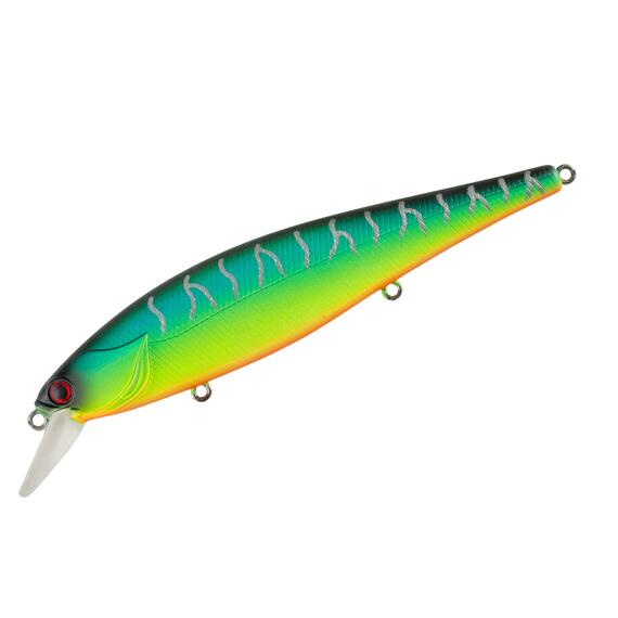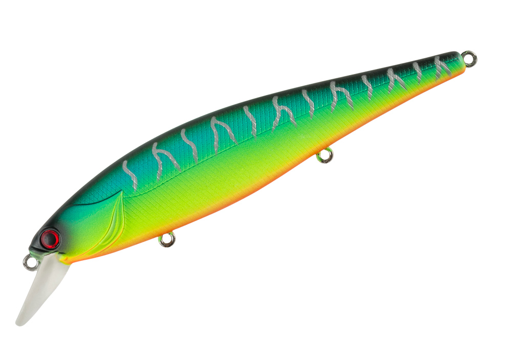 Воблер TsuYoki MOVER 128SP MOVER 128 SP относится к так называемым «big minnow» с нейтральной плавучестью, ставшими весьма популярными у рыболовов, охотящимся за трофейными хищниками. Особенности дизайна: MOVER 128 SP имеет две, разделенные боковой линией, рельефные фактуры поверхности. Верхняя часть выполнена в виде ромбовидных насечек - чешуек, нижняя в виде косых насечек. Головная часть воблера имитирует жаберные крышки рыбки, а 3D глаза завершают реалистичный дизайн приманки.В конструкцию MOVER 128 SP включены системы дальнего заброса и баланса. У приманки три мощных тройника соответствующего размера, силовая фурнитура и заводные кольца . Присущее воблерам TsuYoki современное ЛКП и широкая цветовая гамма в каталоге. Заброс и анимация: Благодаря солидному весу (26 гр), системе дальнего заброса и своей геометрии MOVER 128 SP улетает на 35+ метров. В тесте на дальность использовался комплект: удилище 7,6 фута быстрого строя с тестом до 38 гр. Катушка 3000 . Шнур #1,2. Ловля на MOVER 128 SP должна включать в себя все элементы анимации, доступные для воблеров класса минноу. На равномерной проводке воблер имеет свою собственную игру. Поэтому данный вид анимации нужно обязательно использовать при работе с MOVER 128 SP. Чередование равномерной проводки с паузами, а так же длинные протяжки с паузами ( вариации стоп-энд-гоу) – хороший способ соблазнить хищника на поклевку. При рывковой анимации MOVER 128 SP чутко реагирует на рывковую проводку совершенно различной степени интенсивности. Найти ту самую комбинацию рывков и пауз, которая сегодня и сейчас придется по вкусу хищникам – интересная задача для рыболова. После рывка и завершения разворота воблер демонстрирует остаточные колебания ,покачивая боками. Во время самого рывка мощно играет, показывая бока и роллингуя. Главное - понять настроение хищника, чтобы задать правильный темп проводки. Активный хищник – агрессивная анимация из серий коротких и злых рывков с непродолжительными паузами. Если же хищник пассивен – мягкий твичинг с продолжительными паузами. Особенно хорошо мягкий твичинг проявляет себя осенью, при ловле над бровками с перепадом глубин 2-6 метров. При ловле с лодки позицию лучше занять примерно на середине бровки, над глубиной 3-4 метра. Сделав заброс вдоль бровки, вывести приманку в рабочий горизонт и начать анимацию, состоящую из мягких и коротких рывков с паузами различной продолжительности… Применение поводка из струны #2 не оказывает существенного влияния на плавучесть и достоверность анимации воблера. Комплект снастей: удилище 7,0-7,6 фута быстрого строя с тестом до 35-42 гр. Катушка 3000-4000. Шнур 20-25 лб (#1.2-1.5 по японской шкале) Минноу Суспендер (SP) 128 мм 26 гр Заглубление 0,8-1,8 м